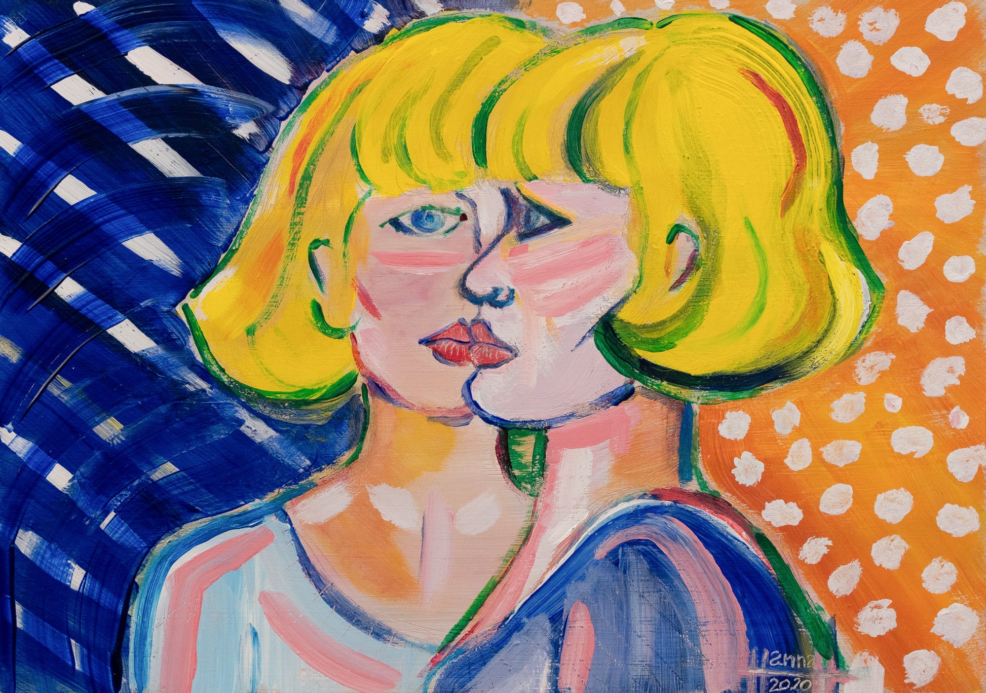 A vibrant, expressive painting that explores the theme of identity and inner conflict. The dual-faced figure, rendered in bold, neon yellow hair and pastel-toned skin, seems to represent two sides of the same person—merged yet distinct. The juxtaposition of blue, swirling lines on one side and warm, dotted orange on the other evokes the contrast between emotions, thoughts, or perspectives. The use of exaggerated colors and thick brushstrokes gives the piece a surreal and abstract quality, while maintaining an engaging sense of human emotion and psychological depth.