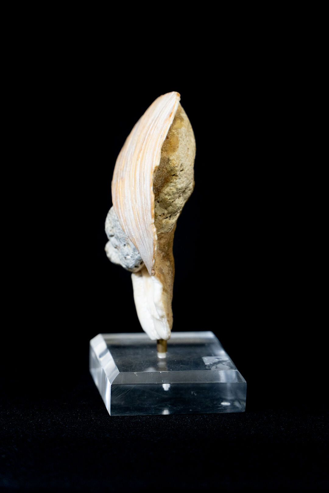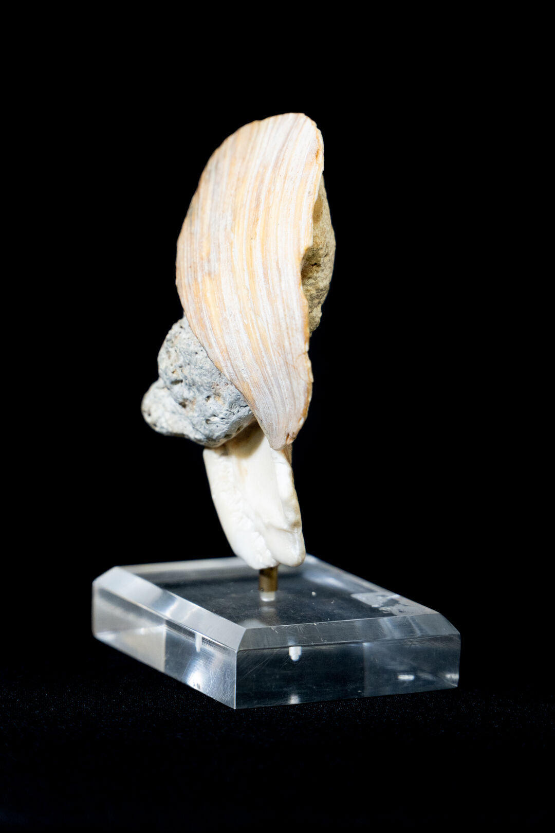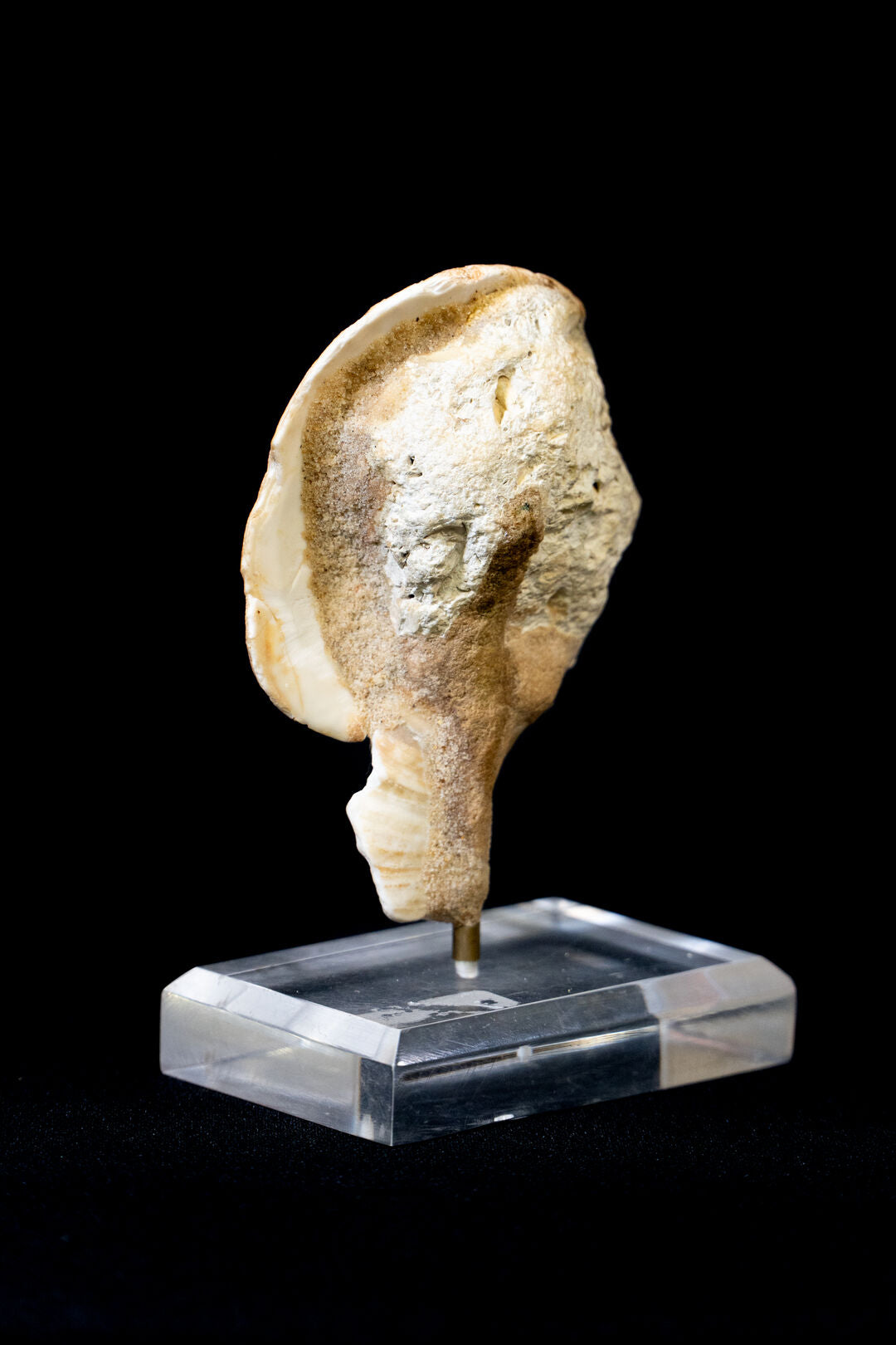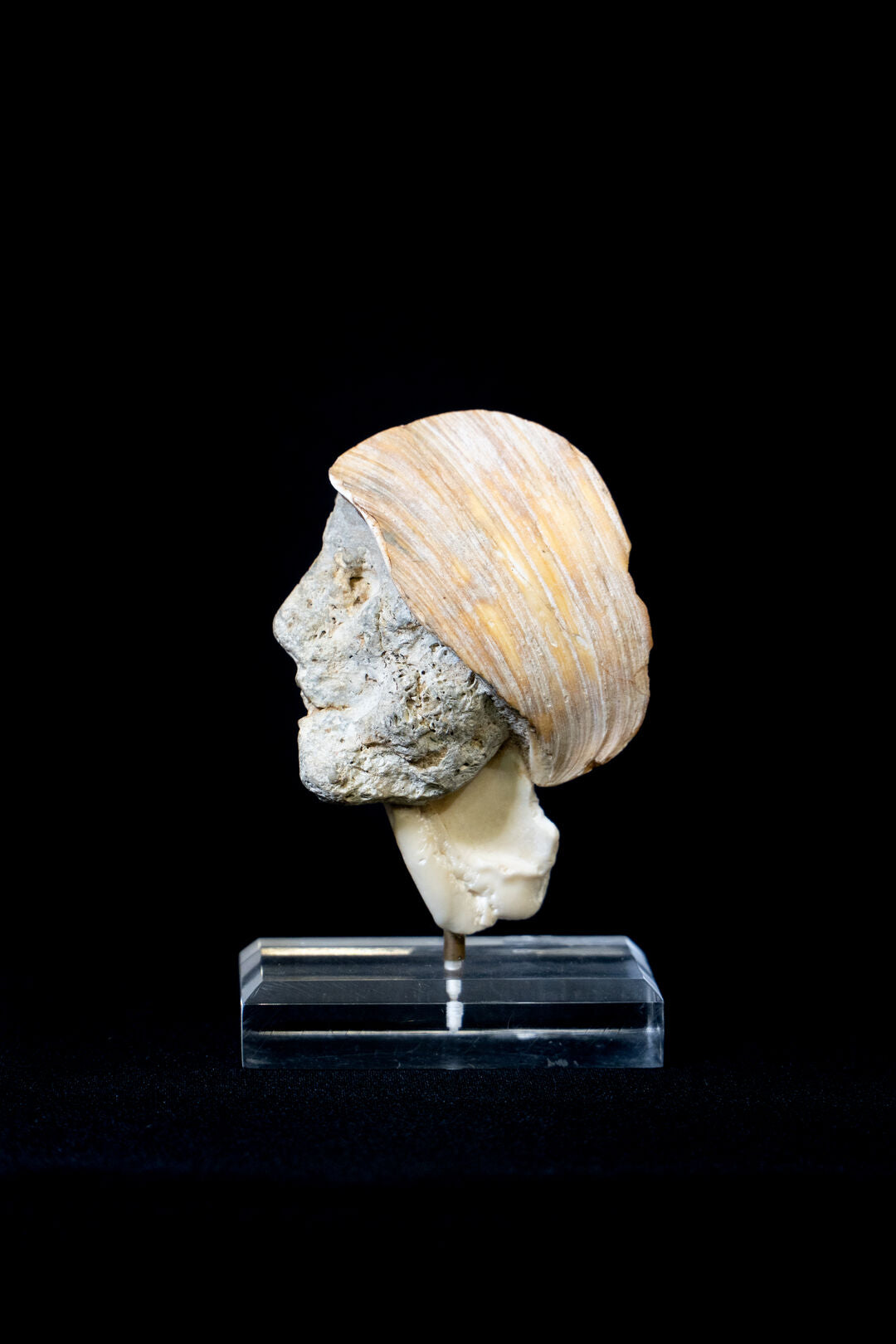 A poetic sculpture that merges stone and shell to evoke the profile of a contemplative figure, reminiscent of a classic portrait silhouette. The delicately layered shell forms a natural “hair,” gracefully crowning the head and enhancing the quiet elegance of the piece. The sculpture seems to capture the essence of memories whispered by the sea, representing both resilience and serenity. This harmonious blend of organic elements invites viewers to reflect on the timeless beauty found within nature’s simple materials.