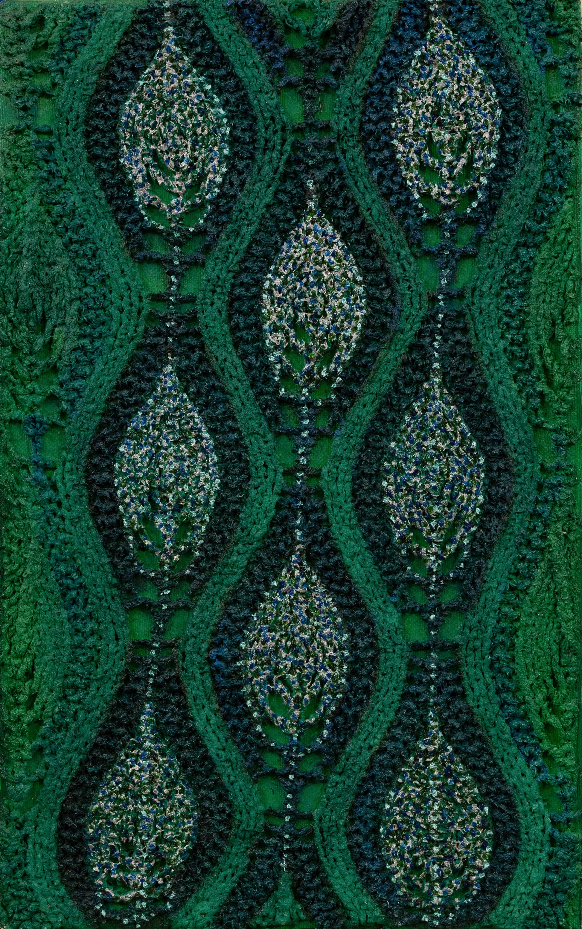 This abstract artwork showcases intricate patterns in shades of green and blue. The textured, layered approach adds a tactile dimension, making the piece both visually and physically engaging.