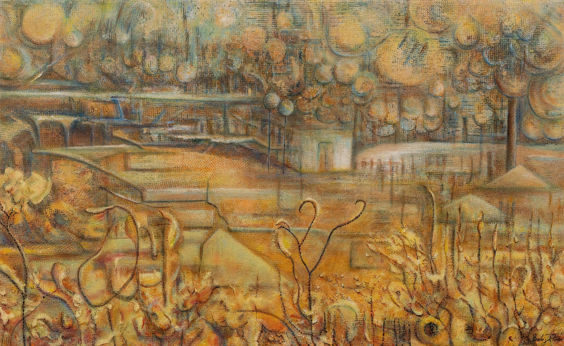 This painting depicts an ethereal landscape where nature and fantasy blend seamlessly. The scene is filled with abstract, swirling forms representing trees, plants, and mysterious structures. The warm, golden hues create a magical and inviting atmosphere, while the intricate details invite viewers to lose themselves in the depths of this enchanted forest. The composition suggests a dreamlike journey through a mystical world.