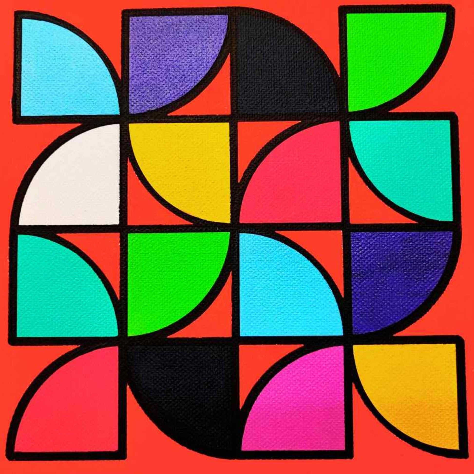 Eoline is a celebration of color and geometry, fusing vibrant hues with bold black outlines to form dynamic, curved patterns on a vivid red background.
