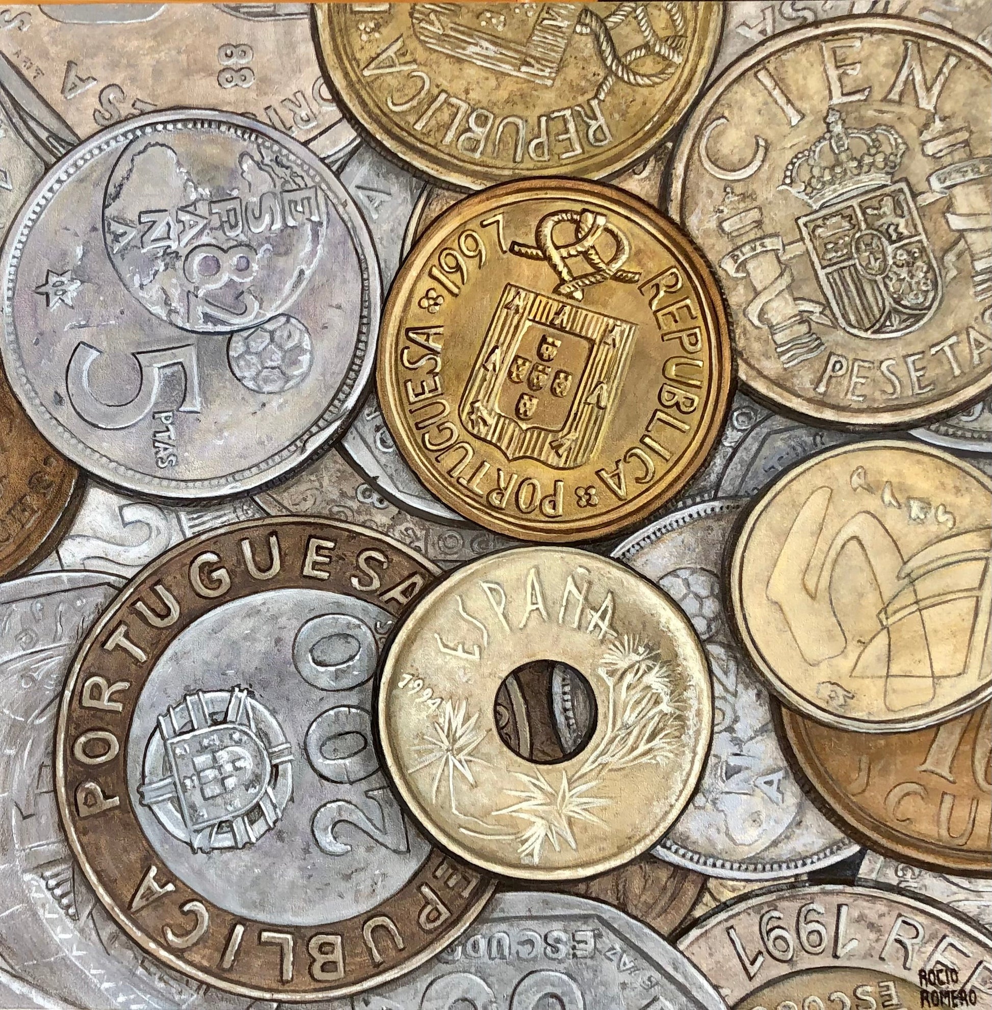 A hyper-realistic painting depicting a collection of vintage Portuguese escudos and Spanish pesetas. The intricate details of each coin, from their worn surfaces to engraved patterns and symbols, evoke a sense of nostalgia and historical richness.