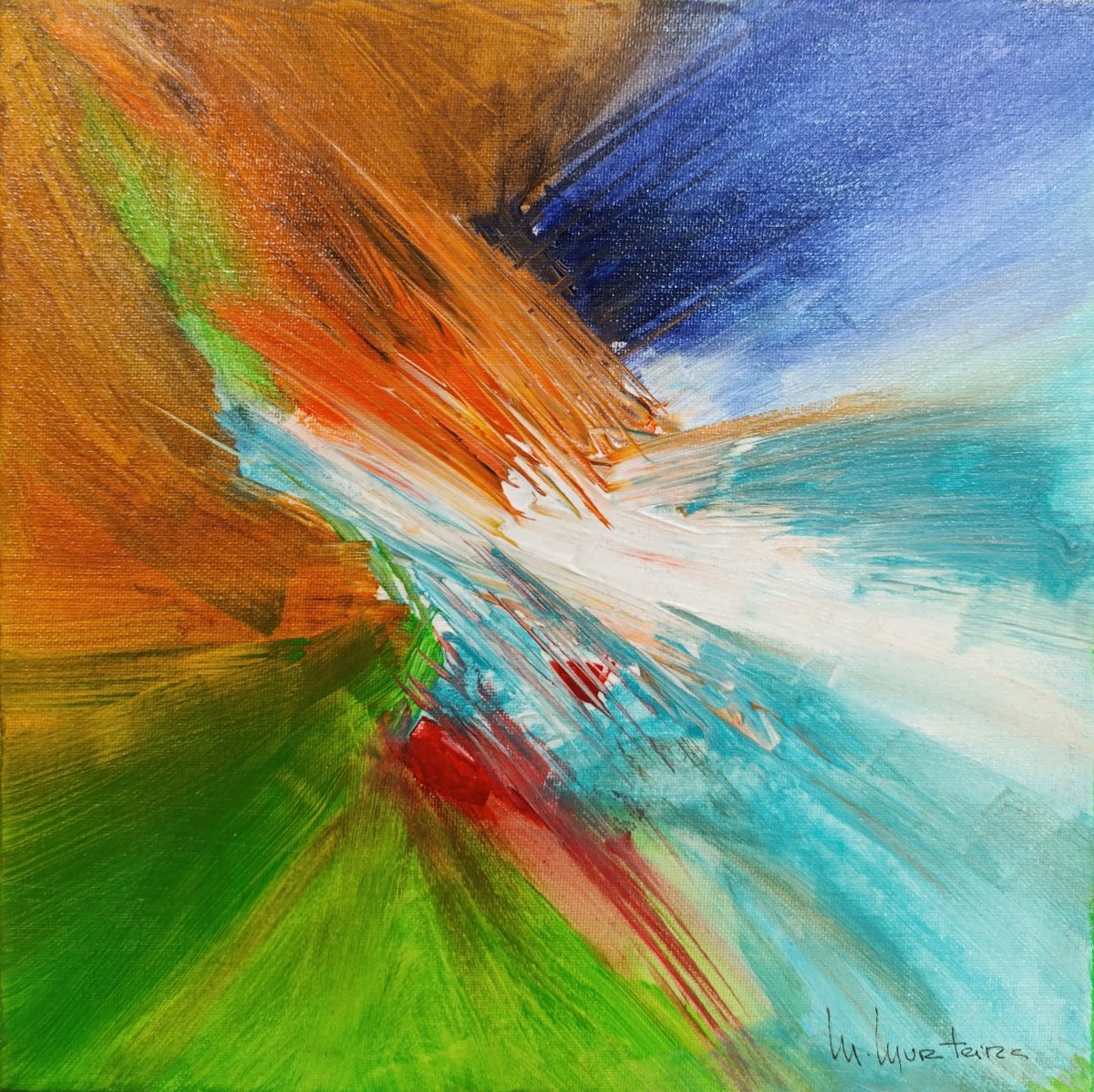 A bold and dynamic piece that explores the fusion of contrasting color fields. The composition appears to swirl and converge towards a central, radiant point, where warm oranges and cool blues collide, creating a sense of motion and intensity. The lower portion is dominated by lush greens, suggesting a connection to nature, while the upper right corner bursts into vibrant shades of blue, evoking the expanse of the sky or water. The brushstrokes are energetic and sweeping, pulling the viewer into the center of the action, while the bright white highlights add an element of light and clarity. The painting conveys the beauty of opposing forces coming together, creating a harmonious and balanced energy.