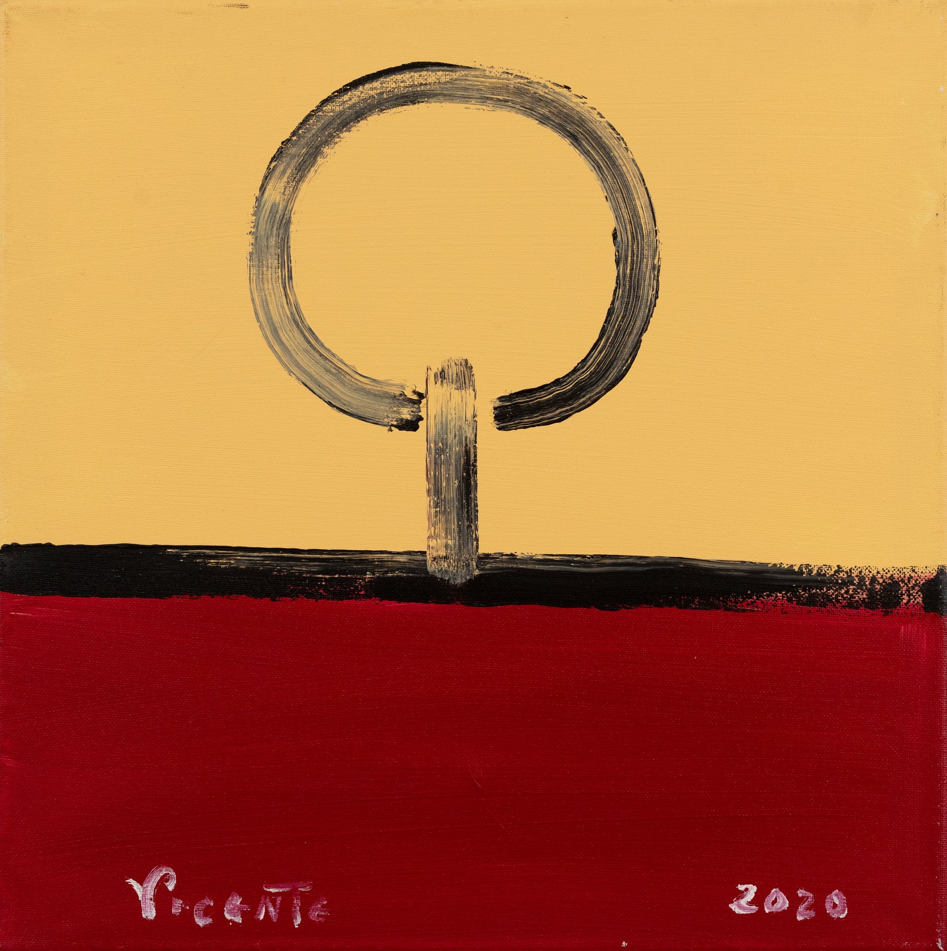 Bold and simple, this painting features a large black circle centered over a horizon line split between a vivid red and a mellow yellow. The brush strokes are visible and textured, adding a raw energy to the otherwise minimalistic composition.