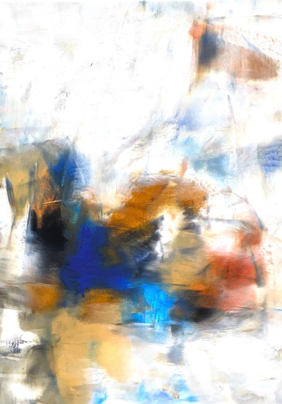 This abstract piece combines soft, blurry shapes and vibrant splashes of color to create an ethereal, dream-like landscape. Hues of blue, orange, and white blend seamlessly, evoking a sense of tranquility and fluidity. The painting's abstract nature allows for multiple interpretations, inviting viewers to immerse themselves in its calming and otherworldly atmosphere.