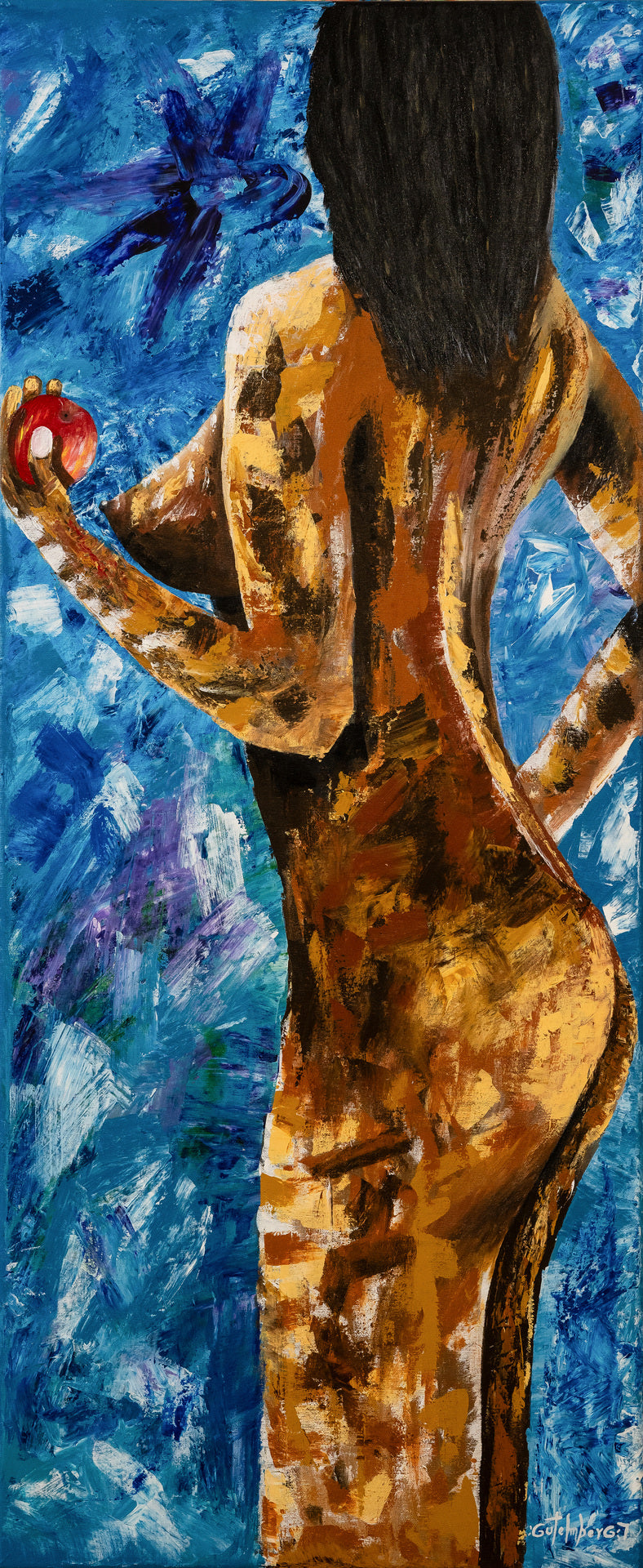 This expressive painting depicts a figure of a woman from behind, looking over her shoulder. She holds an apple in her hand, evoking the biblical theme of Eve.