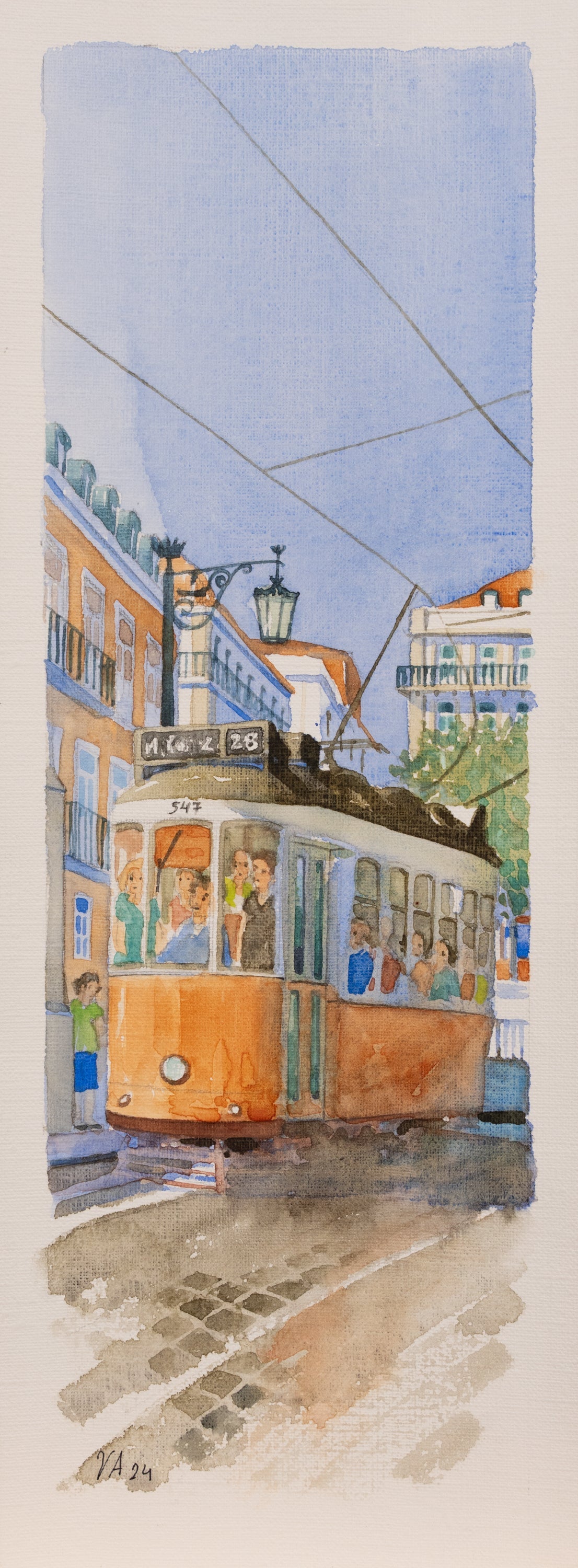 In this scene, a tram moves through the city under a dramatic evening sky. The use of blue hues and the detailed rendering of light and shadows convey the end of a busy day, with passengers aboard heading to their destinations.