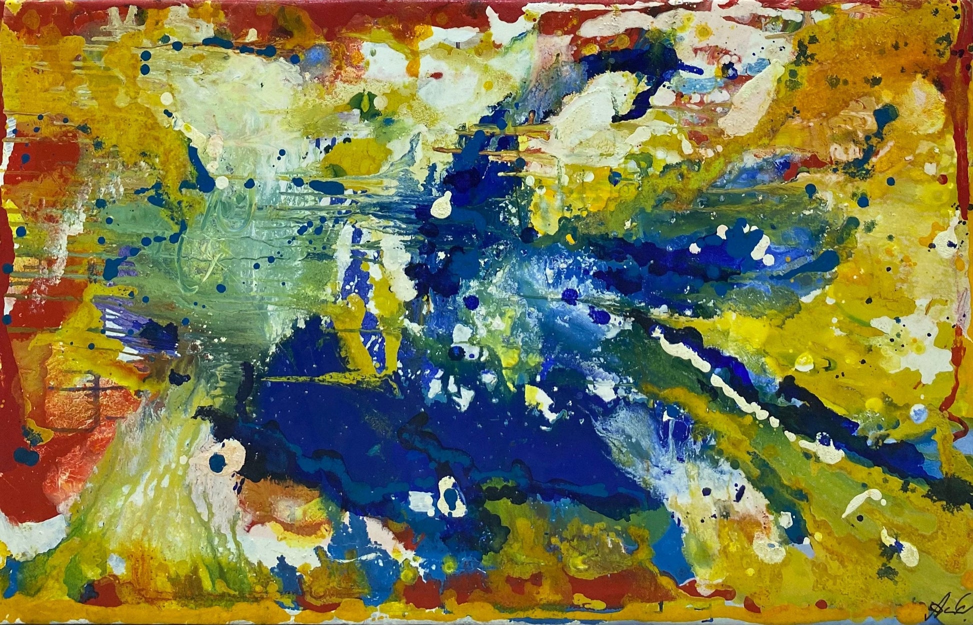This piece captures a lively burst of color and energy, with bold splashes of yellow, blue, green, and red interacting dynamically across the canvas. Each stroke and splatter appears to pulsate, creating a sense of explosive movement and raw expression. The layers of paint and varying textures evoke natural forces, like a powerful river or turbulent skies, channeling the spirit of Abstract Expressionism. "Explosive Harmony" invites viewers to immerse themselves in its chaotic yet balanced composition, finding order within the vibrant disarray.