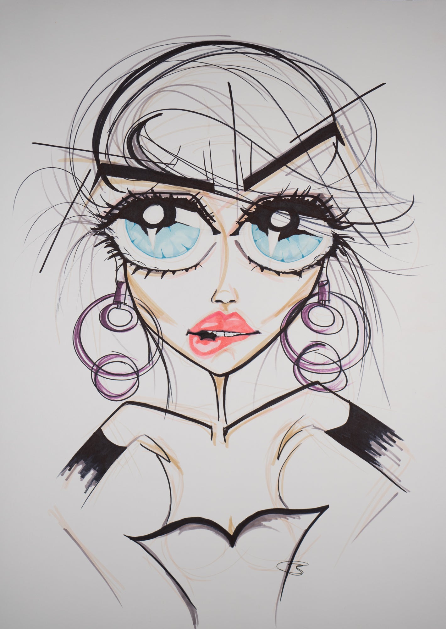 This illustration depicts a striking woman with wind-swept hair and captivating, large blue eyes, accented by stylish, round earrings and a chic black outfit with sharp angles that suggest a modern edge.
