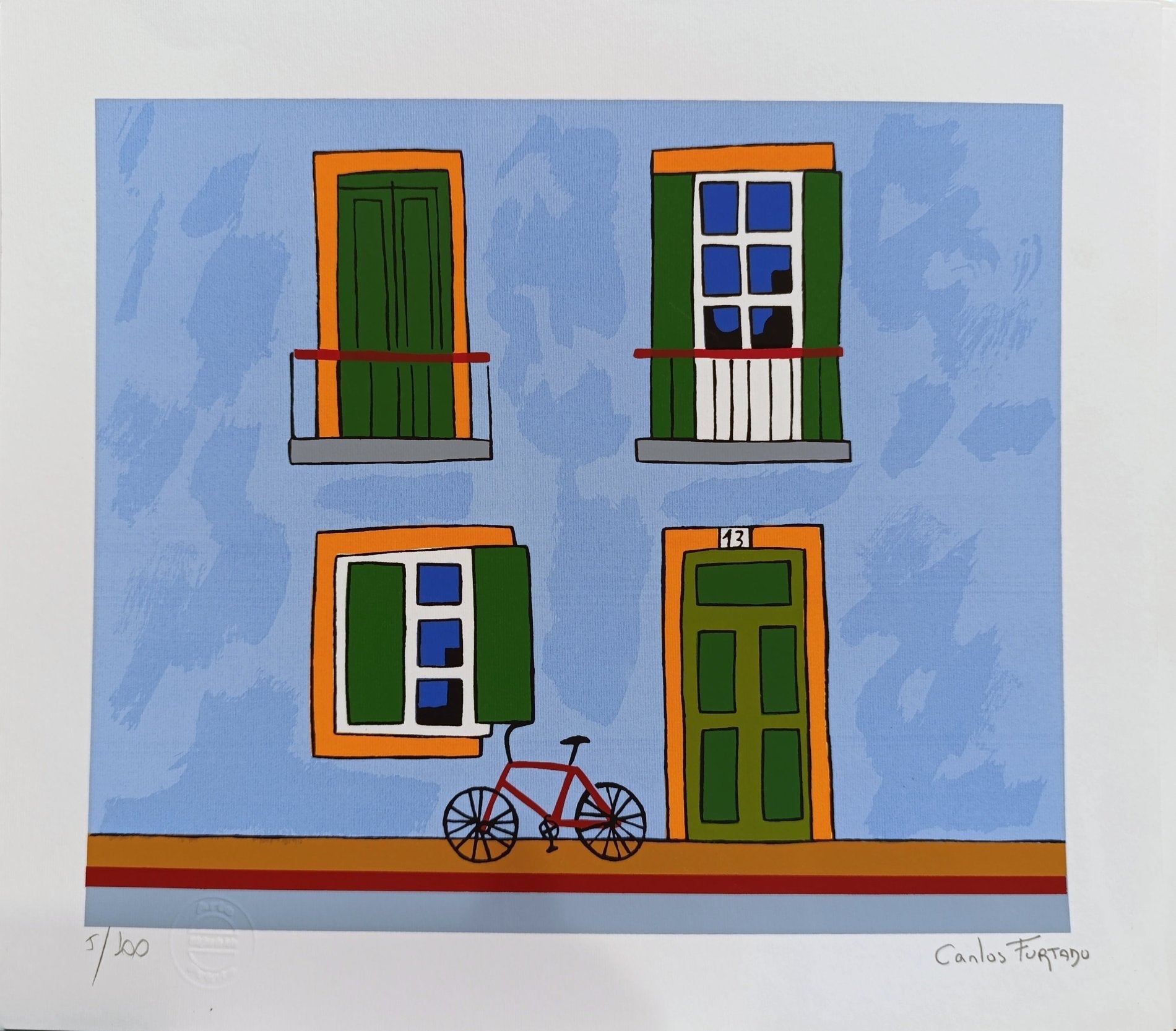 Blue Edition is a cheerful and vibrant depiction of a residential facade. The light blue background contrasts beautifully with the bold orange window frames and the rich green shutters and door. A red bicycle adds a playful touch to the piece, bringing in a sense of everyday life within a simplified and colorful world. This limited edition print on smooth, high-quality paper would be a perfect addition to modern, minimalist spaces that celebrate vibrant color schemes and urban art styles.