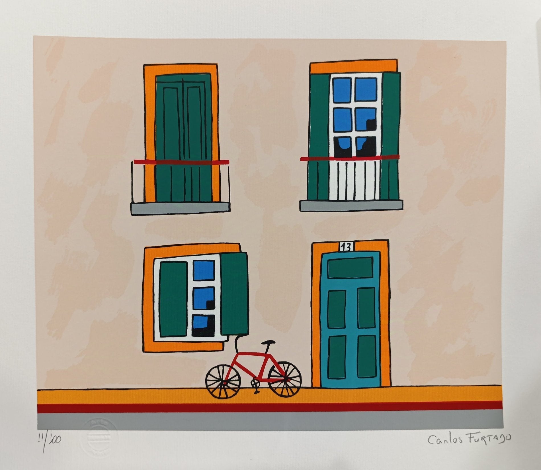 Rustic Charm Edition captures the beauty of a quaint urban street, with its beige-toned facade and deep green accents on the windows and door. The vibrant red bicycle resting against the wall adds a playful contrast, while the orange window frames provide warmth and character to the scene. This limited edition print beautifully balances simplicity with detail, making it an excellent addition to any modern or contemporary space.