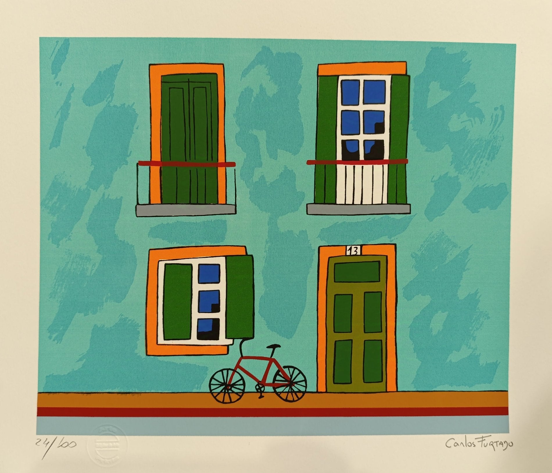 Teal Serenity Edition presents a cool, calming urban scene with its soothing teal-colored walls. The green windows and door, framed by warm orange accents, bring a harmonious balance to the composition. The iconic red bicycle leans casually against the facade, adding a playful yet grounded element to the scene. Perfect for brightening up any room, this limited edition print brings a modern yet tranquil vibe to your space.