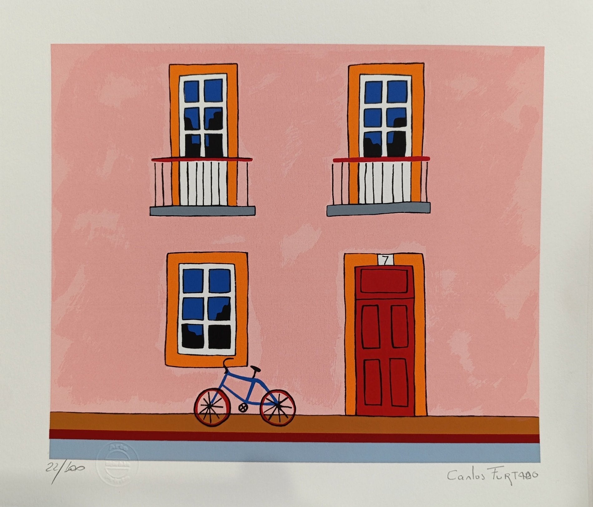 Is a charming print that presents a soft pastel pink facade with vibrant orange accents framing two windows and a bold red door. The small blue bicycle leaning against the facade brings a touch of playfulness and nostalgia to the piece. The simple, flat forms and vivid palette embody the minimalist pop art style, making this print a perfect choice for modern interiors seeking a subtle yet colorful touch. This print is part of a limited edition series, available on smooth, high-quality paper, ensuring a long-lasting and striking piece of wall art.