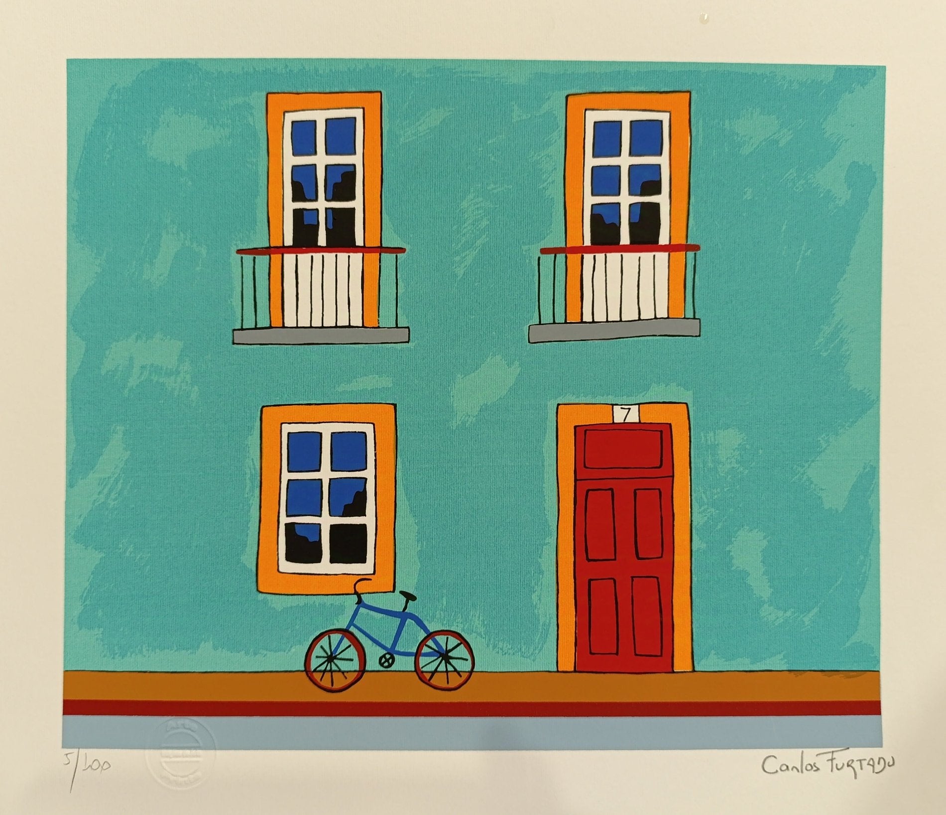 Teal Calm Edition portrays a tranquil and minimalist urban setting, where the teal facade serves as the perfect backdrop for a striking red door and the classic windows framed with orange accents. The blue bicycle adds a touch of whimsy, grounding the scene in everyday simplicity. This limited edition print brings a sense of modern calm, making it an ideal addition to contemporary spaces that seek a pop of color and understated charm.