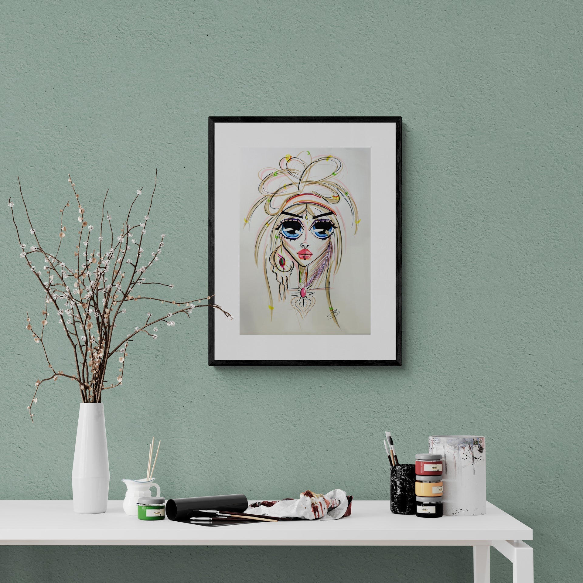 The use of bold, graphic lines with whimsical flourishes gives the artwork an aura of playful introspection.