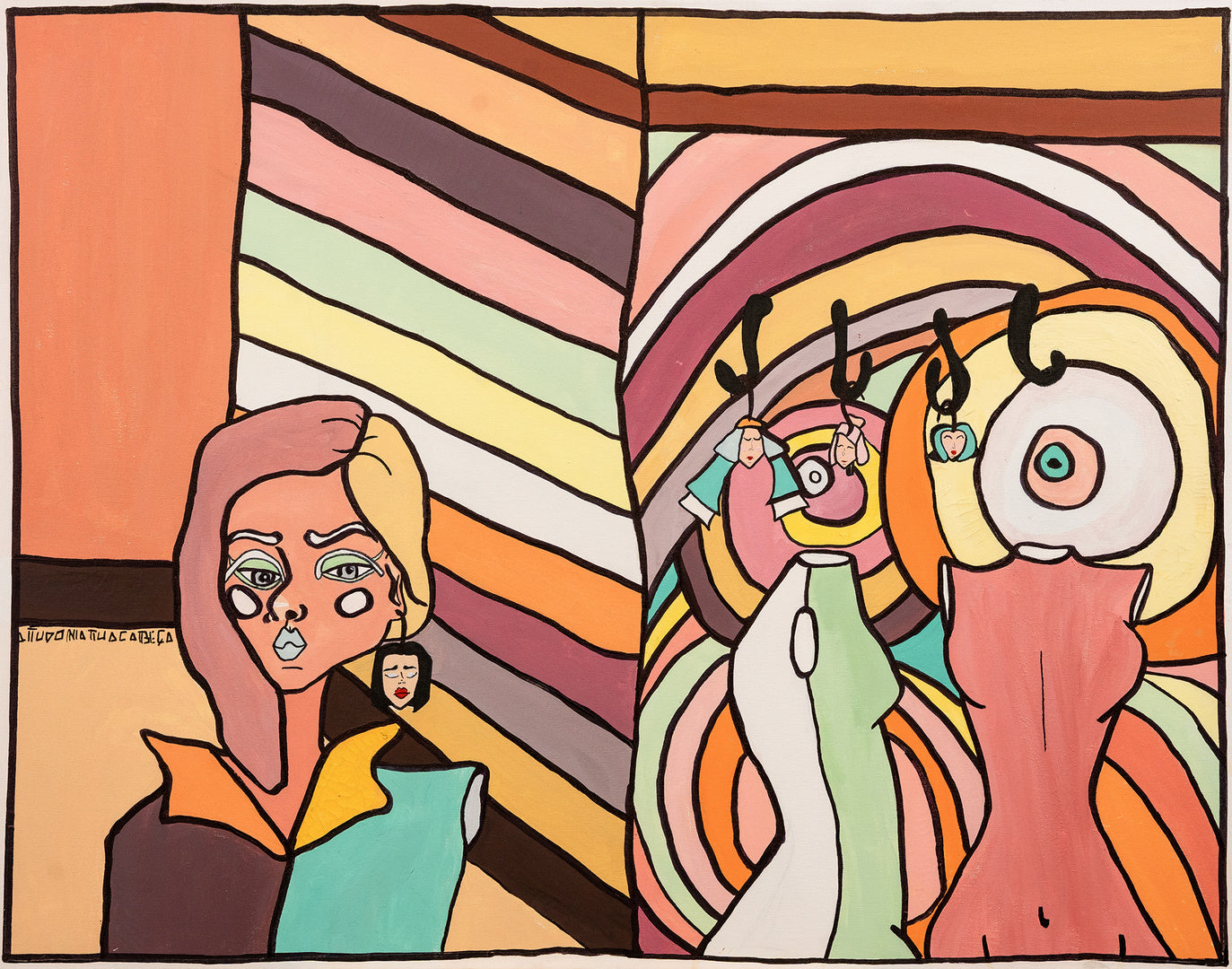 This vibrant painting portrays a split scene with two distinct halves. On the left, a stylized female figure with exaggerated features is depicted against a backdrop of colorful, vertical stripes. She holds a miniature figure that resembles a mask. On the right, the scene is more abstract, featuring a large, swirled pattern in the center that resembles an eye, around which hang several miniature figures on black lines, suggestive of puppets or ornaments.