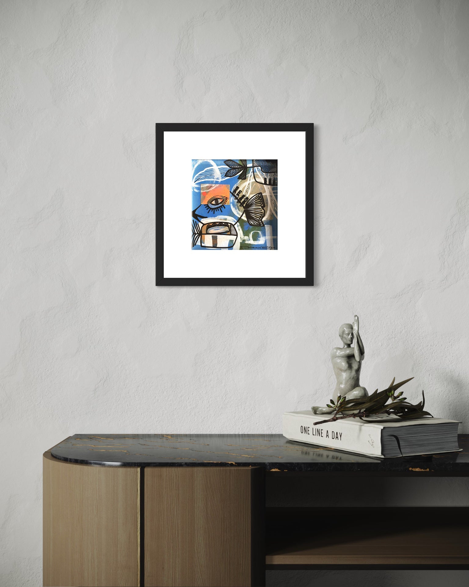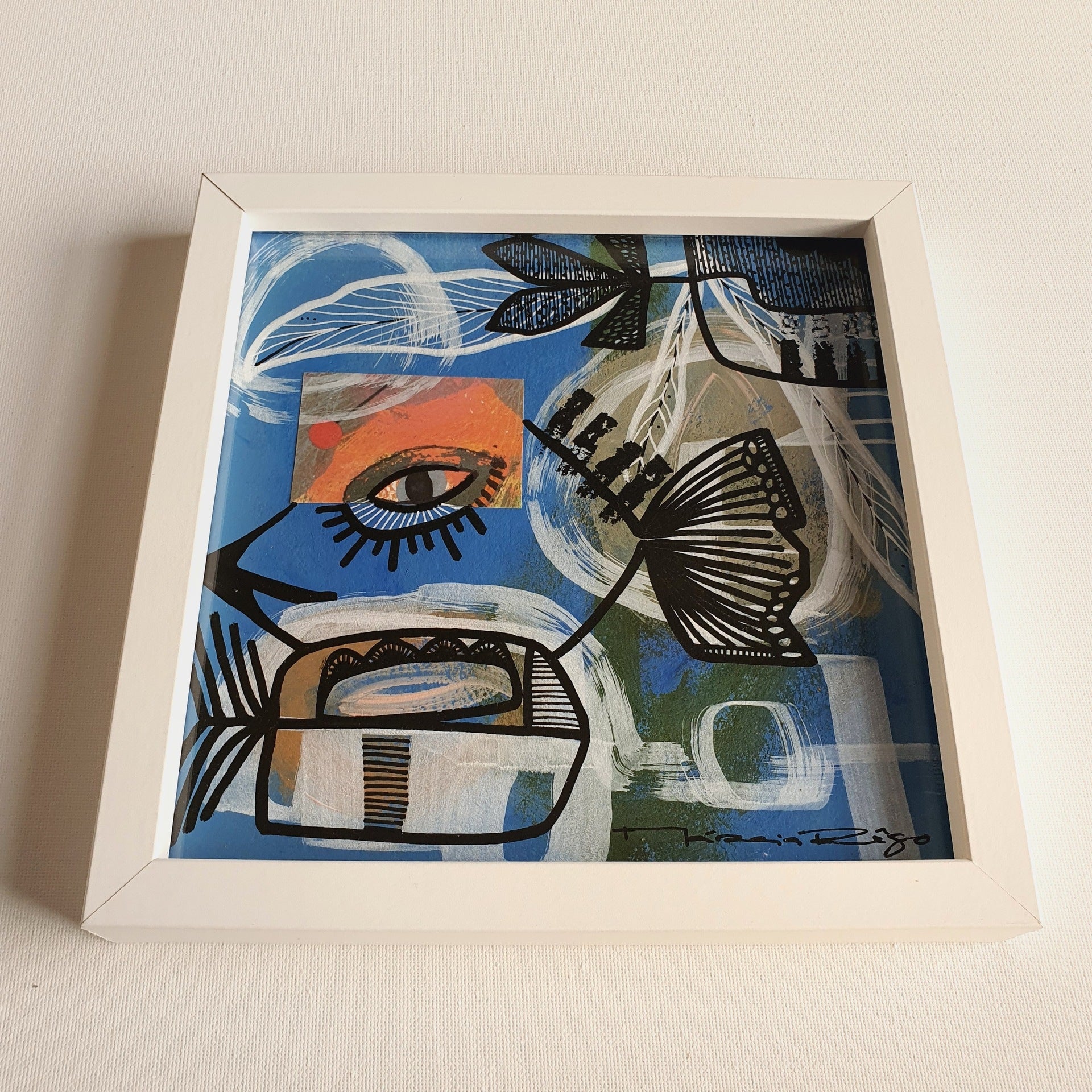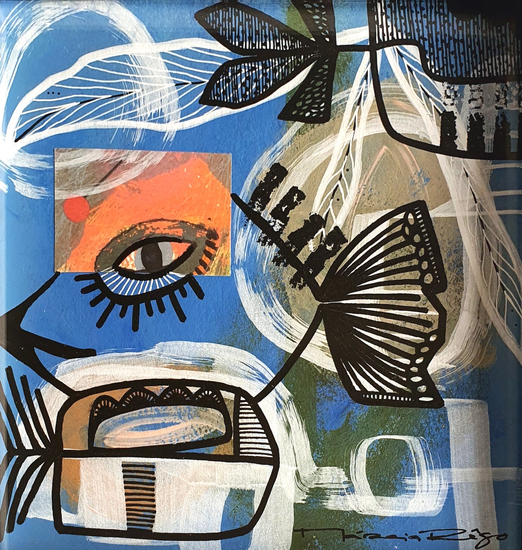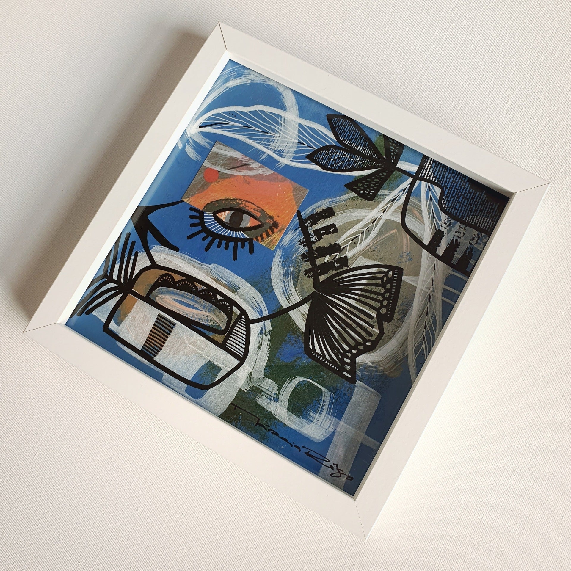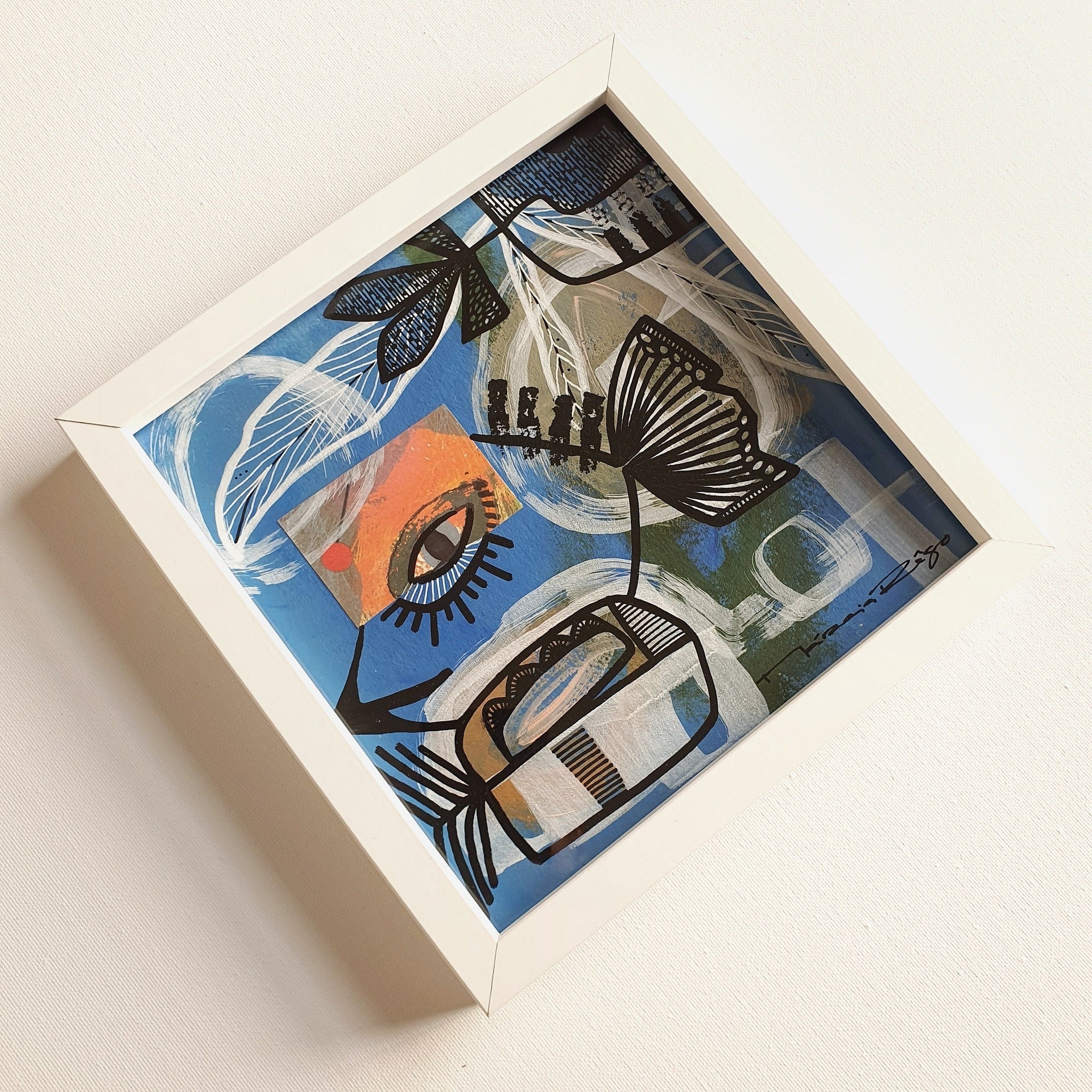 An abstract composition where an eye peeks out from a collage of organic and geometric forms, set against a vibrant blue backdrop. Hints of orange add warmth to the playful interplay of patterns and shapes.