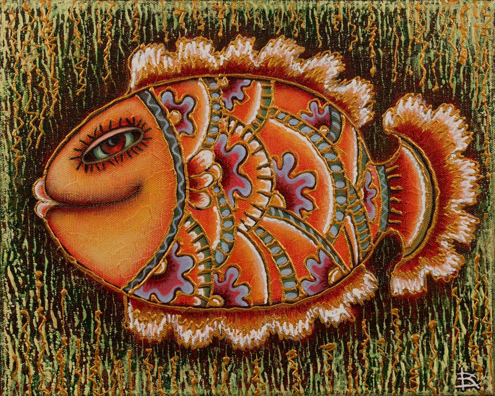 It depicts a highly stylized fish with human-like facial features, including an eye and a playful smile. The fish's body is adorned with intricate patterns and vivid colors that suggest both the natural beauty of sea life and the creative liberties of imaginative artwork.