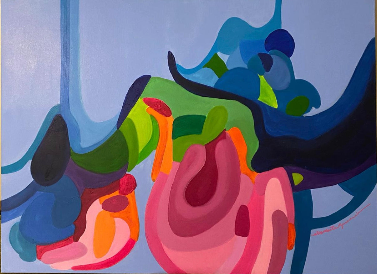 Rich greens, blues, and pinks dominate the canvas, creating a lively interplay of contrast and movement. The soft, curved shapes evoke natural forms, with deep blues suggesting water or sky, while the brighter pinks and oranges offer a grounding warmth. This piece invites viewers to interpret the organic energy flowing through the shapes, making it a work that stimulates personal reflection and emotional engagement.