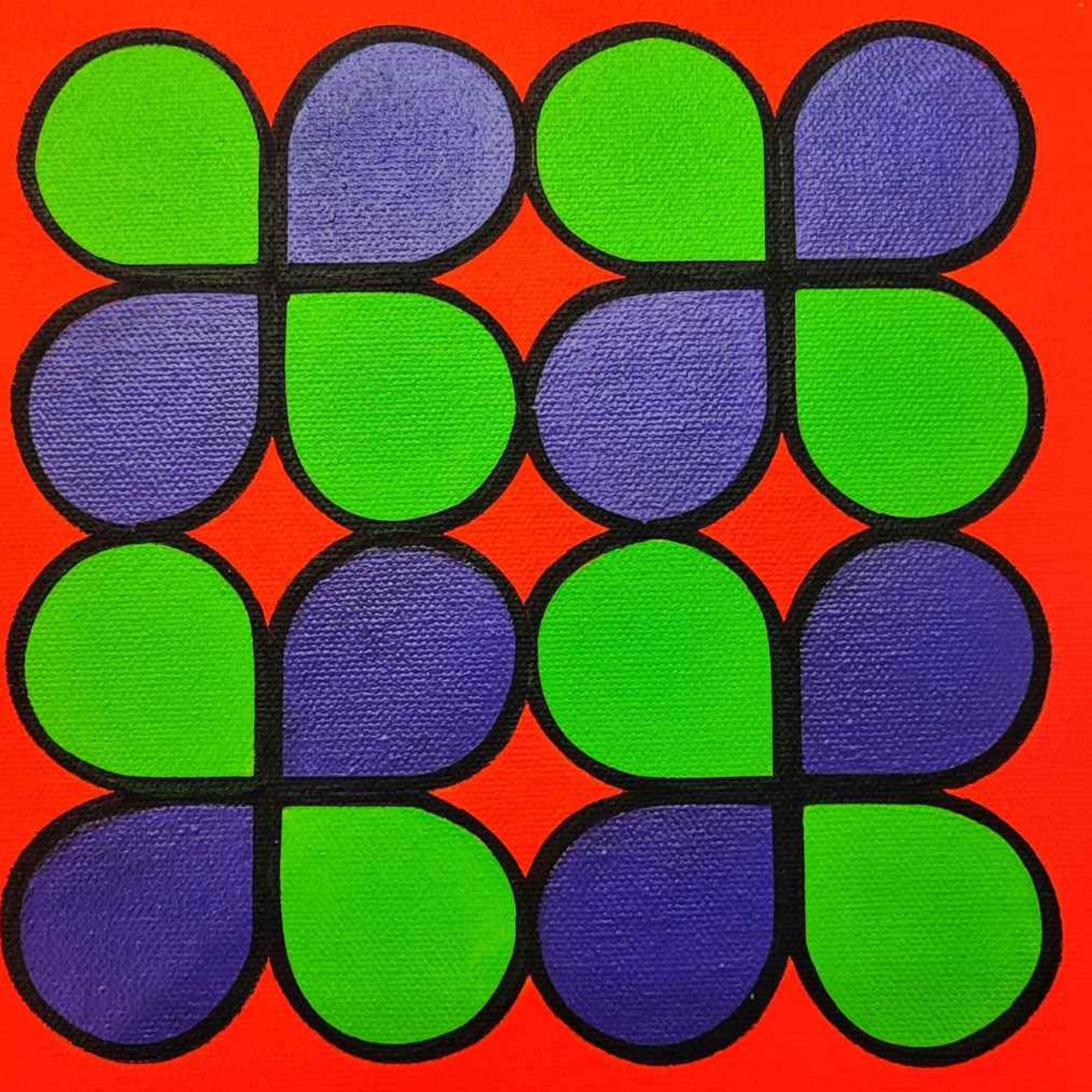 A bold reinterpretation of floral symmetry, Flower Power captivates with its repetitive geometric motif of green and purple petals outlined in black, all set against a striking red background.
