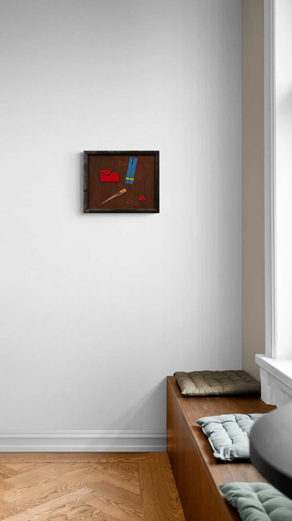 This mixed media piece combines cut-out shapes and painted elements to create a fragmented and abstract depiction of reality. The use of bold colors and varied textures adds depth and intrigue, inviting viewers to piece together the narrative.