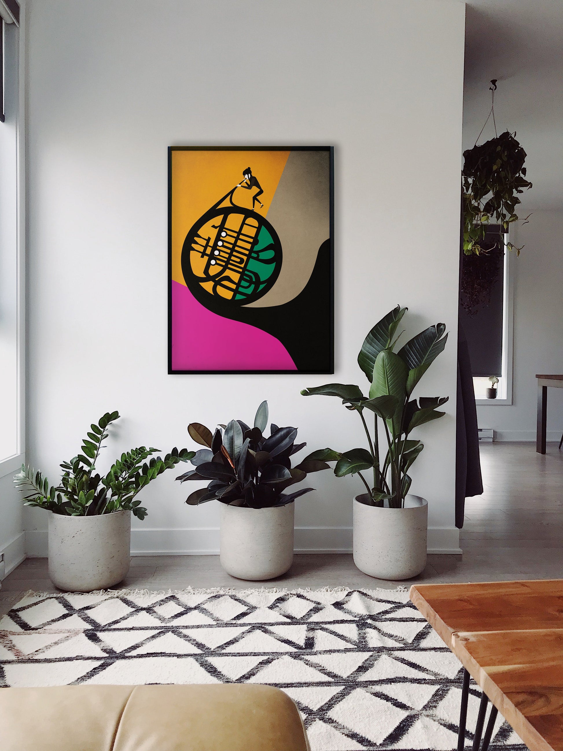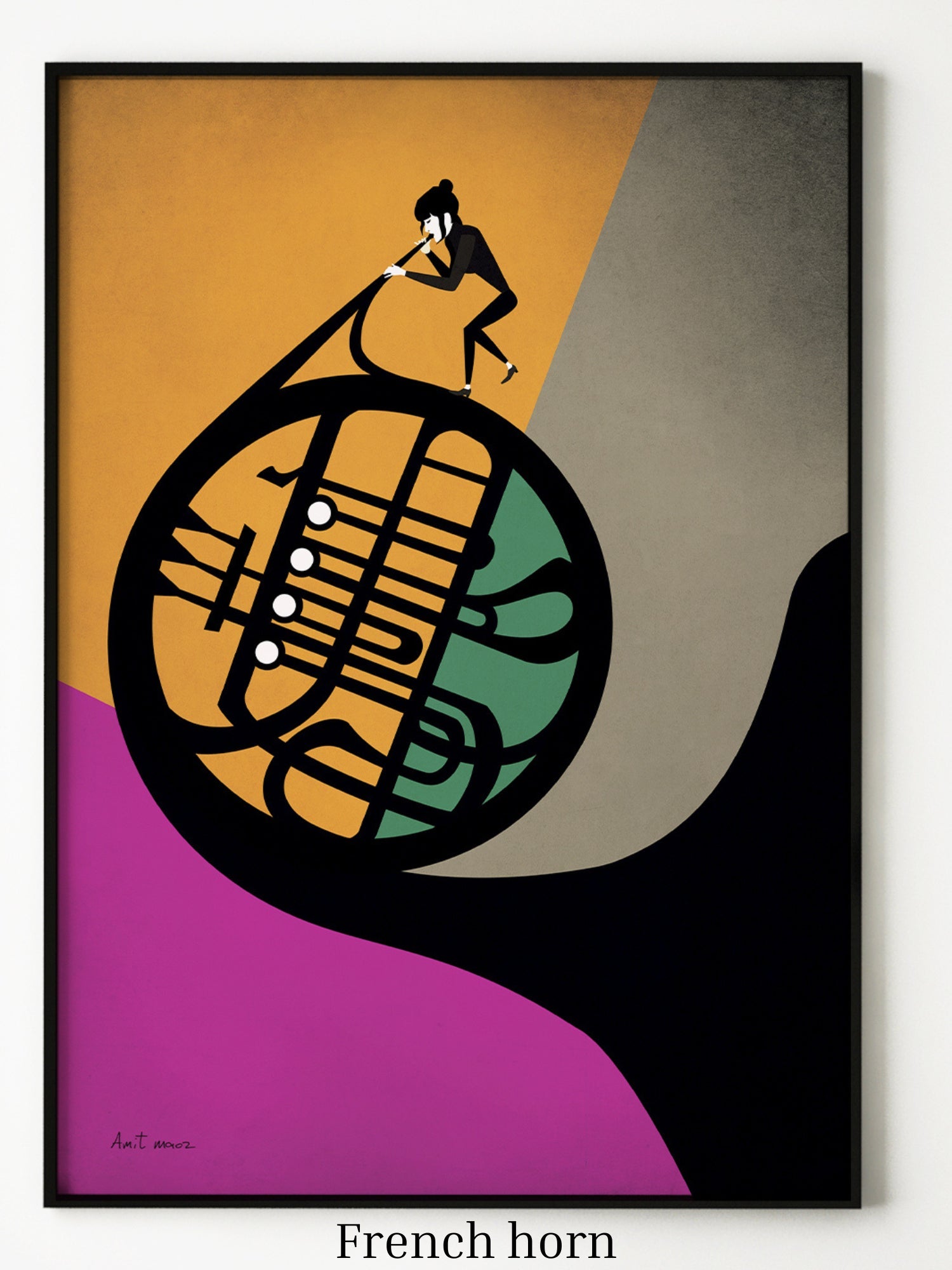 A modern, minimalist illustration featuring a musician energetically playing a French horn, whose spiraling structure dominates the composition. The geometric background with bold shades of orange, magenta, and gray adds vibrancy and movement, highlighting the intricate, flowing form of the instrument.