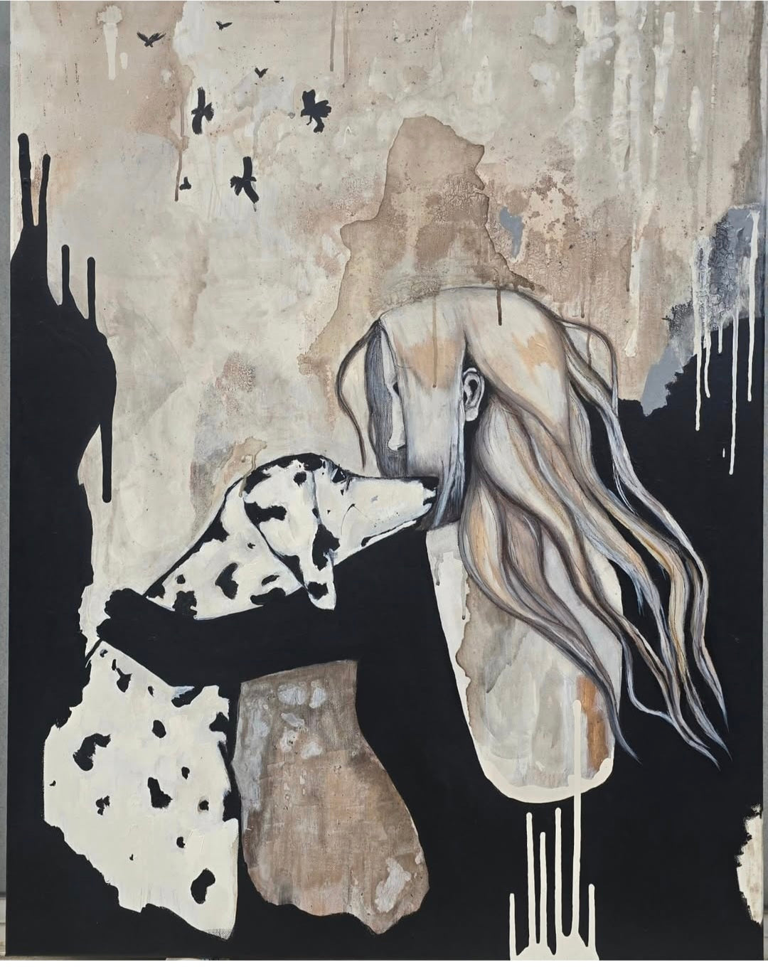 A quiet moment of connection between a woman and a Dalmatian, painted in muted tones and minimalist contrast. The figures emerge from a raw, textured background that evokes memory, loss, and unspoken tenderness.