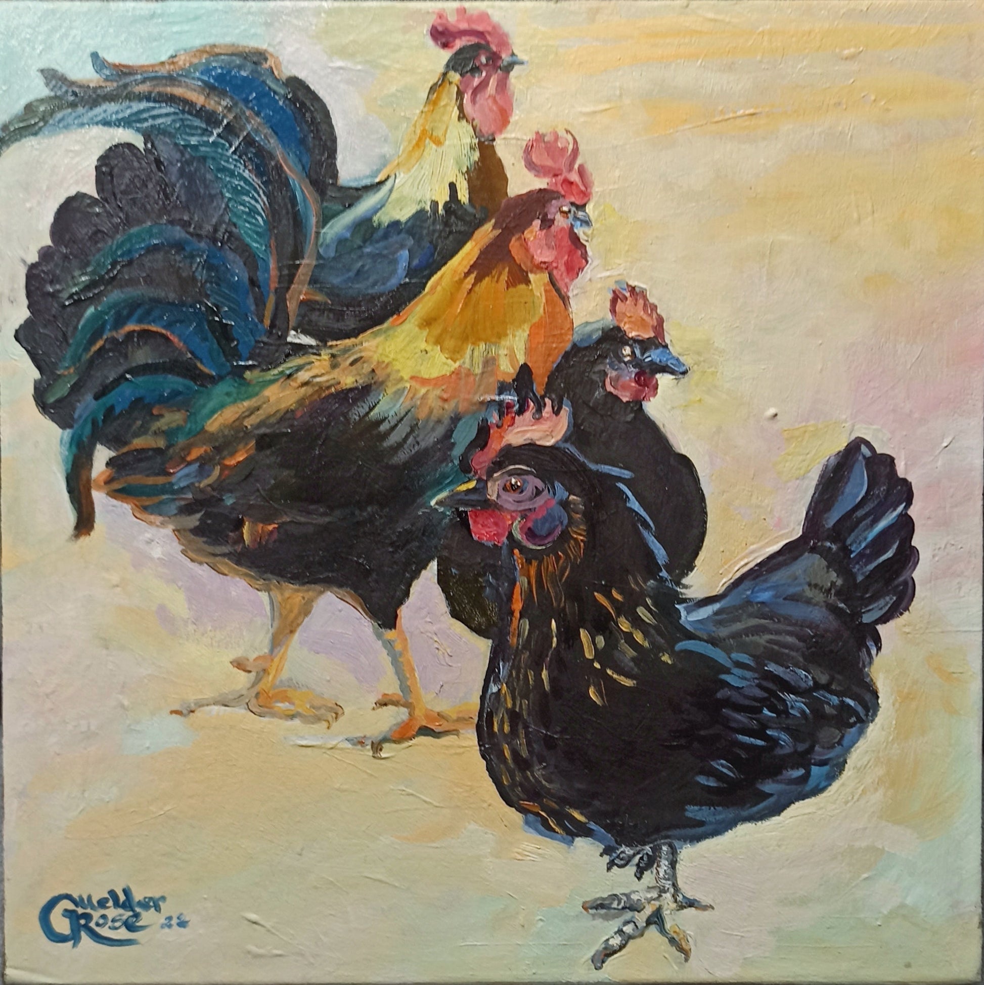 The painting skillfully captures the essence of these remarkable birds with expressive brushstrokes and a vibrant color palette, highlighting their unique personalities and intricate plumage. The artist's use of light adds depth and dimension, drawing the viewer into the scene and creating a compelling connection with the subjects.
