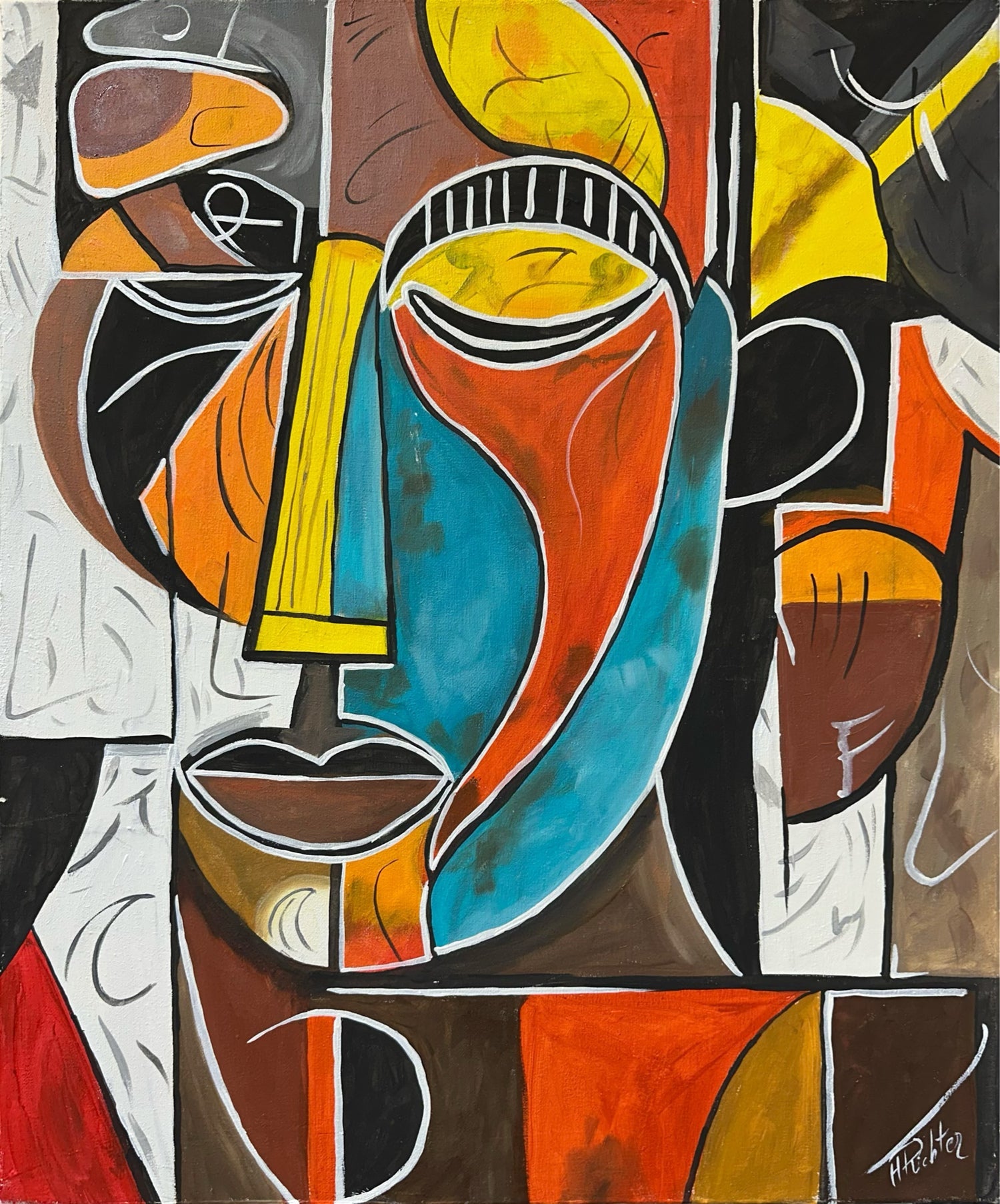 An abstract cubist portrait composed of bold planes of color and fragmented facial features, conveying a vibrant, modern energy.