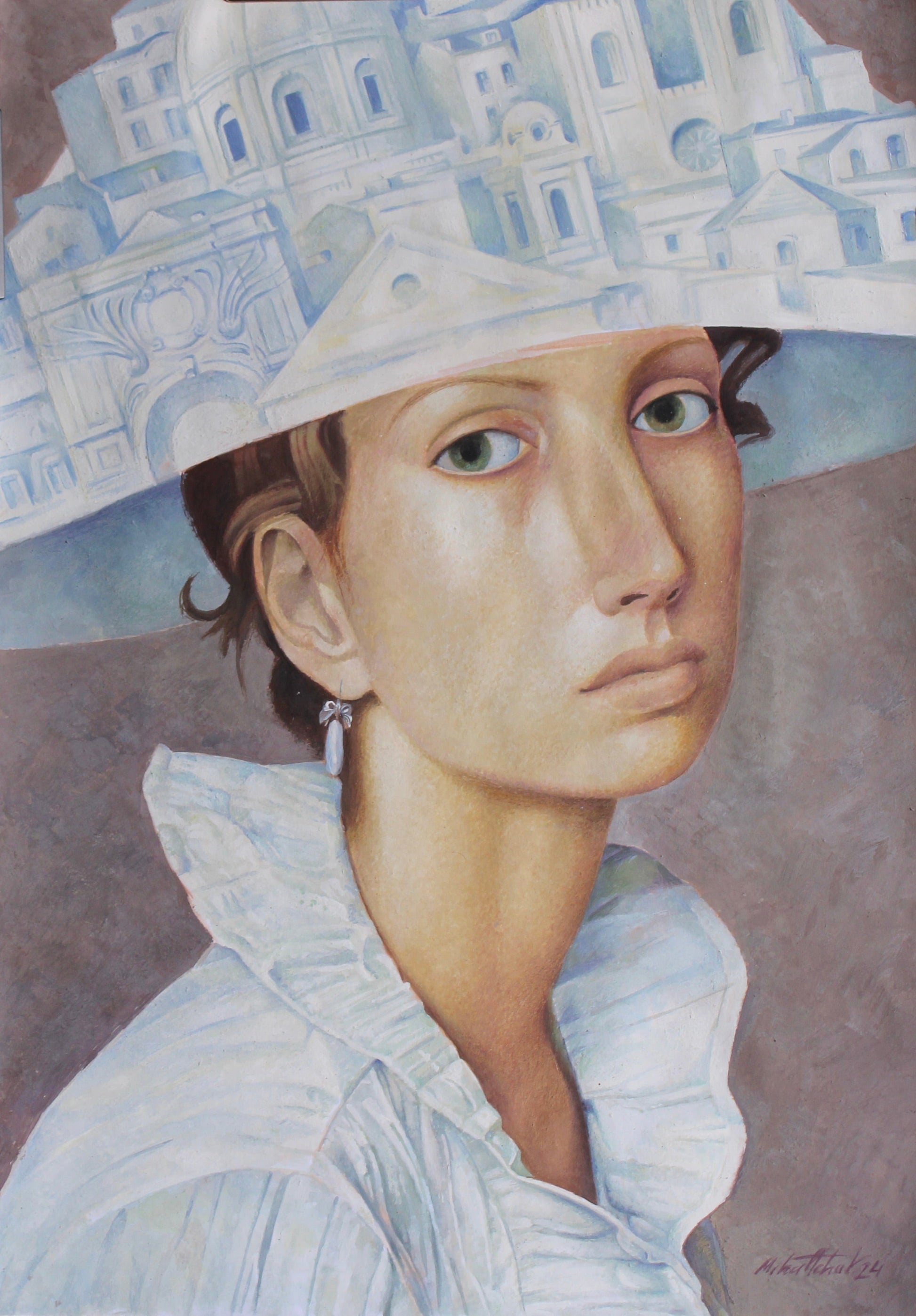 A contemplative portrait where a serene-faced woman wears a cityscape as a hat, merging classical realism with a surreal flourish.