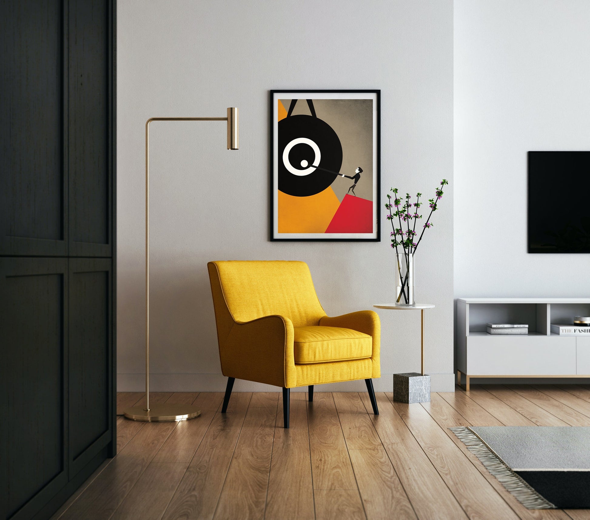A minimalist, modern illustration portraying a musician striking a colossal gong with dramatic force. The bold geometric background, featuring shades of orange, gray, and red, emphasizes the power and anticipation of the resonant sound.