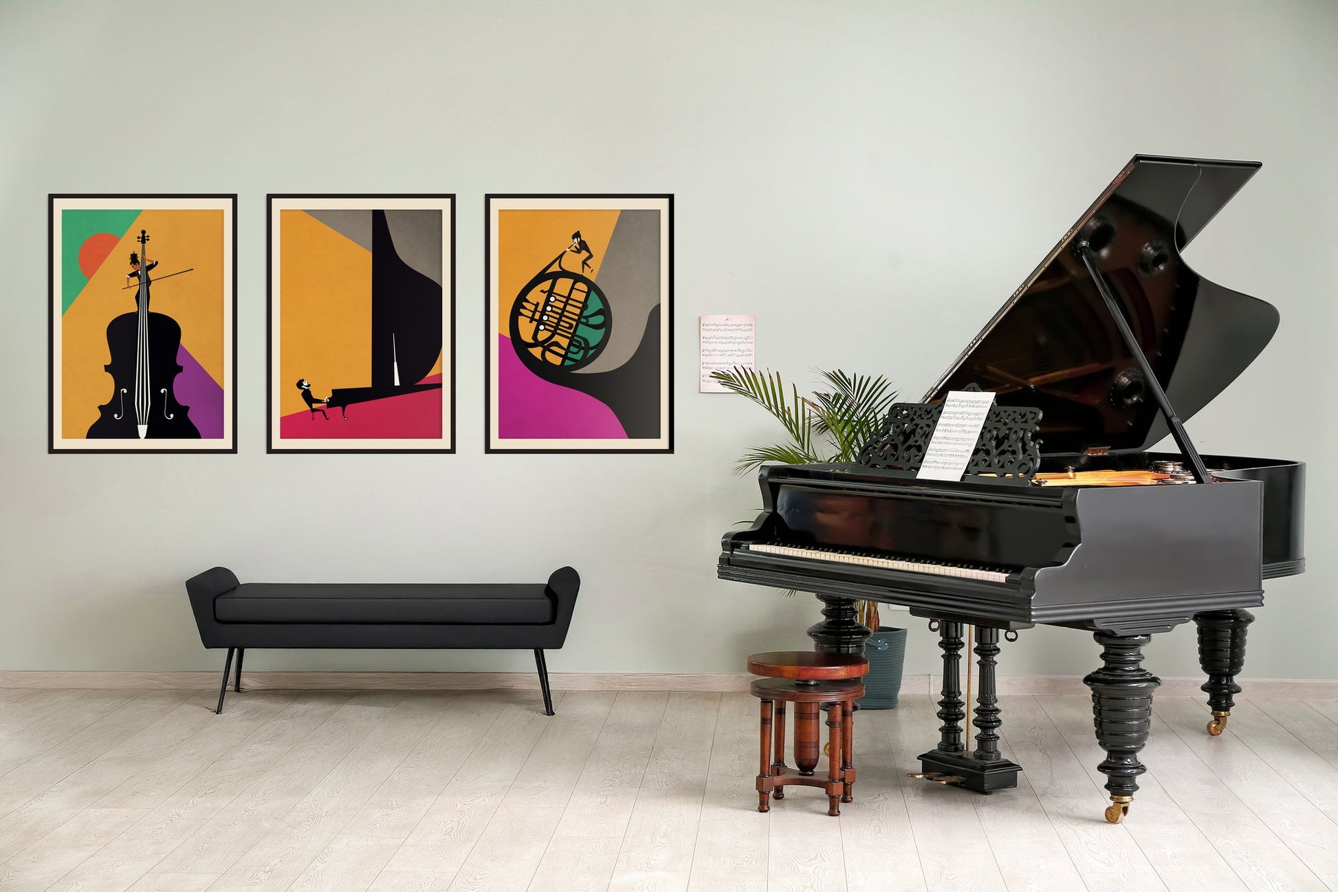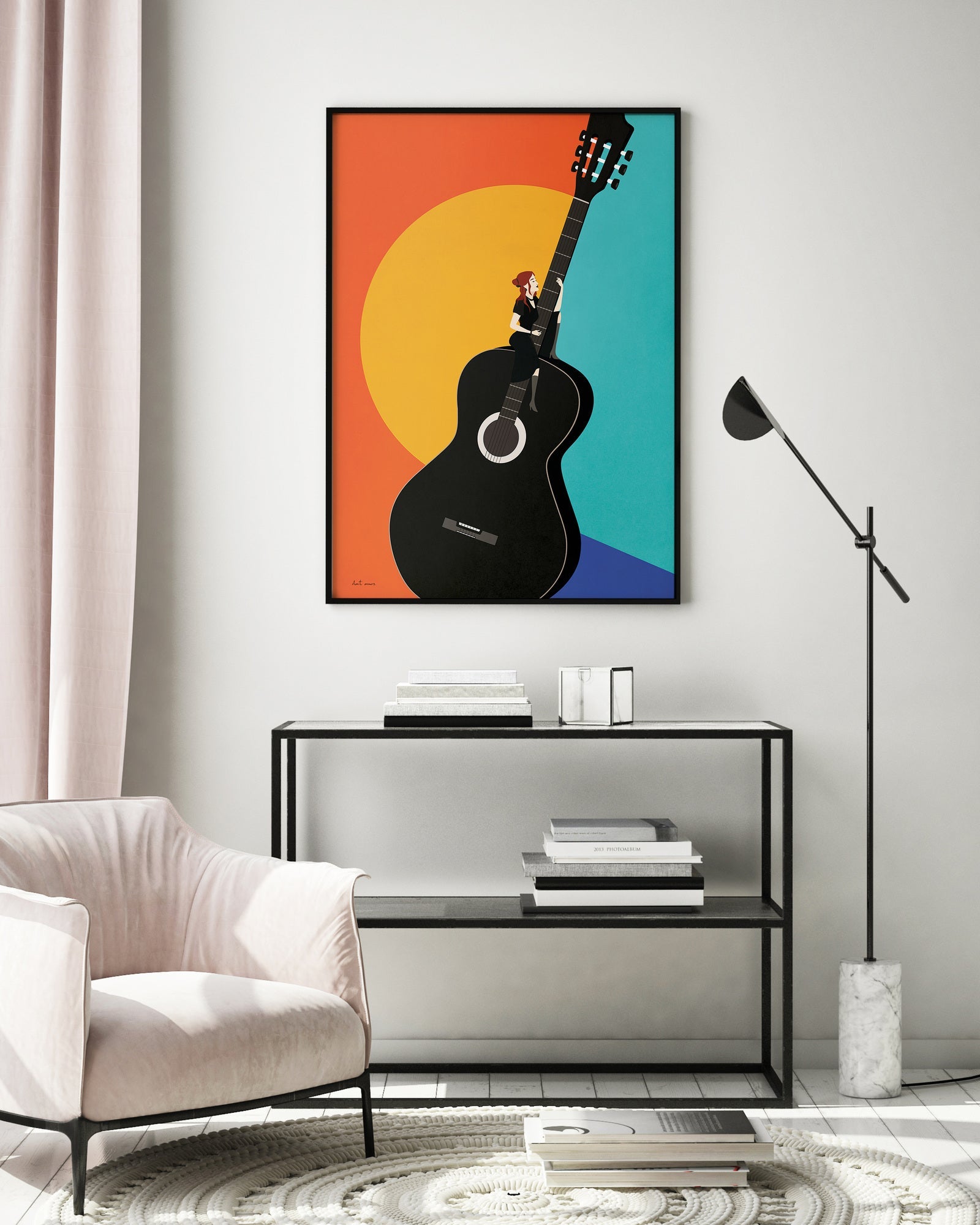 This minimalist design captures the intimacy and power of guitar music through bold contrasts and dynamic composition.