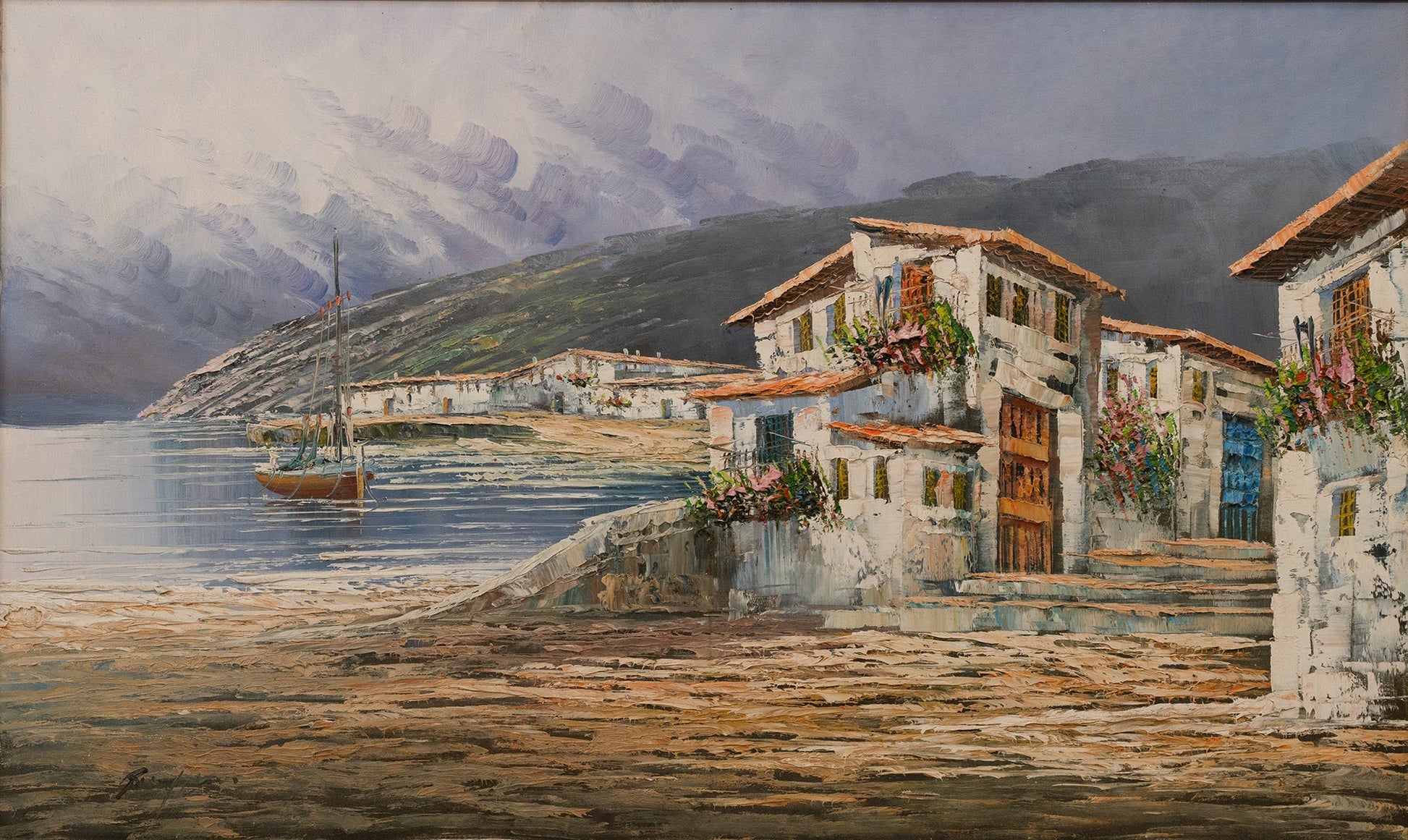 A picturesque harbor scene with rustic buildings lining the shore, a sailboat docked, and mountains in the background. The detailed textures and harmonious colors evoke a charming coastal village.