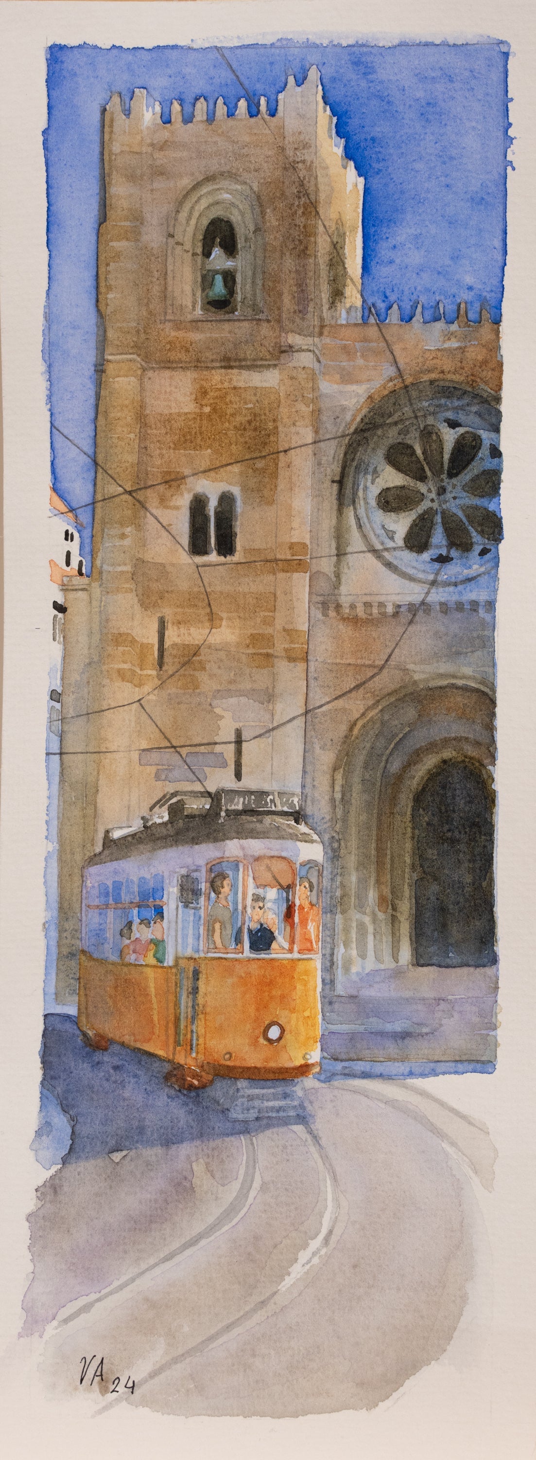"Historic Route" is a stunning watercolor portrayal of a vibrant orange tram as it passes by a grand, historic church, symbolizing the intersection of daily modern life with the enduring splendor of historical architecture. The painting masterfully captures the architectural details of the church, including its intricate stonework and stained glass windows, juxtaposed against the simplicity and functionality of the tram. The deep blue sky adds a dramatic backdrop, enhancing the aged textures of the stone and the bright hues of the tram.