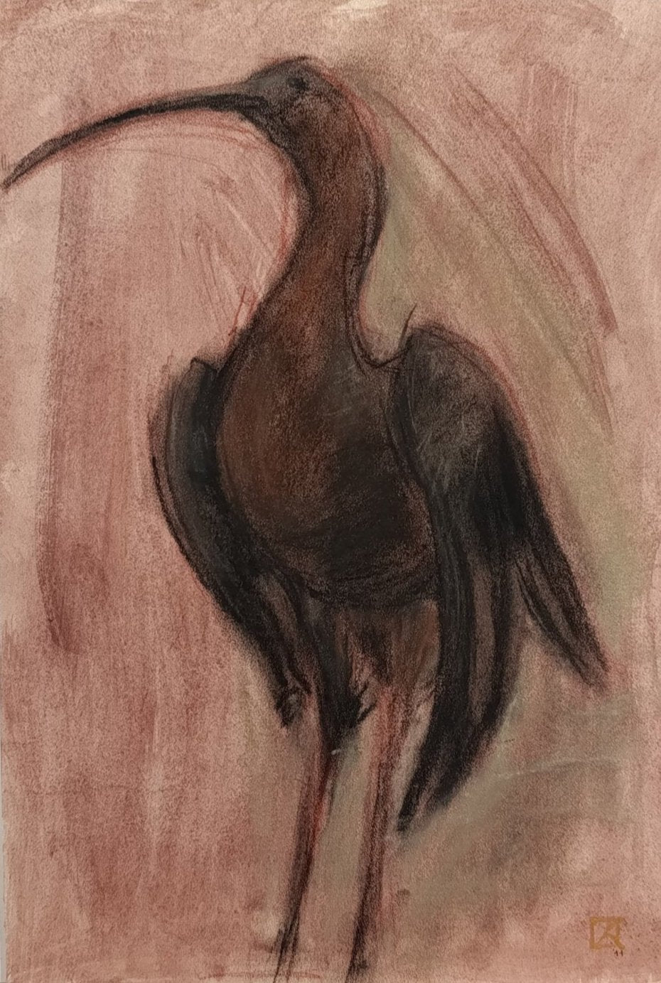 This piece captures the majestic grace of a lone bird ibis, in a serene and minimalist style. With soft strokes of charcoal and earthy tones, the artist evokes a sense of calm and quiet reflection. The elongated neck and body create an elegant silhouette that merges effortlessly with the soft, muted background, emphasizing the bird's tranquil stance. Ideal for lovers of wildlife art with an abstract twist, this artwork brings nature indoors with an understated sophistication.