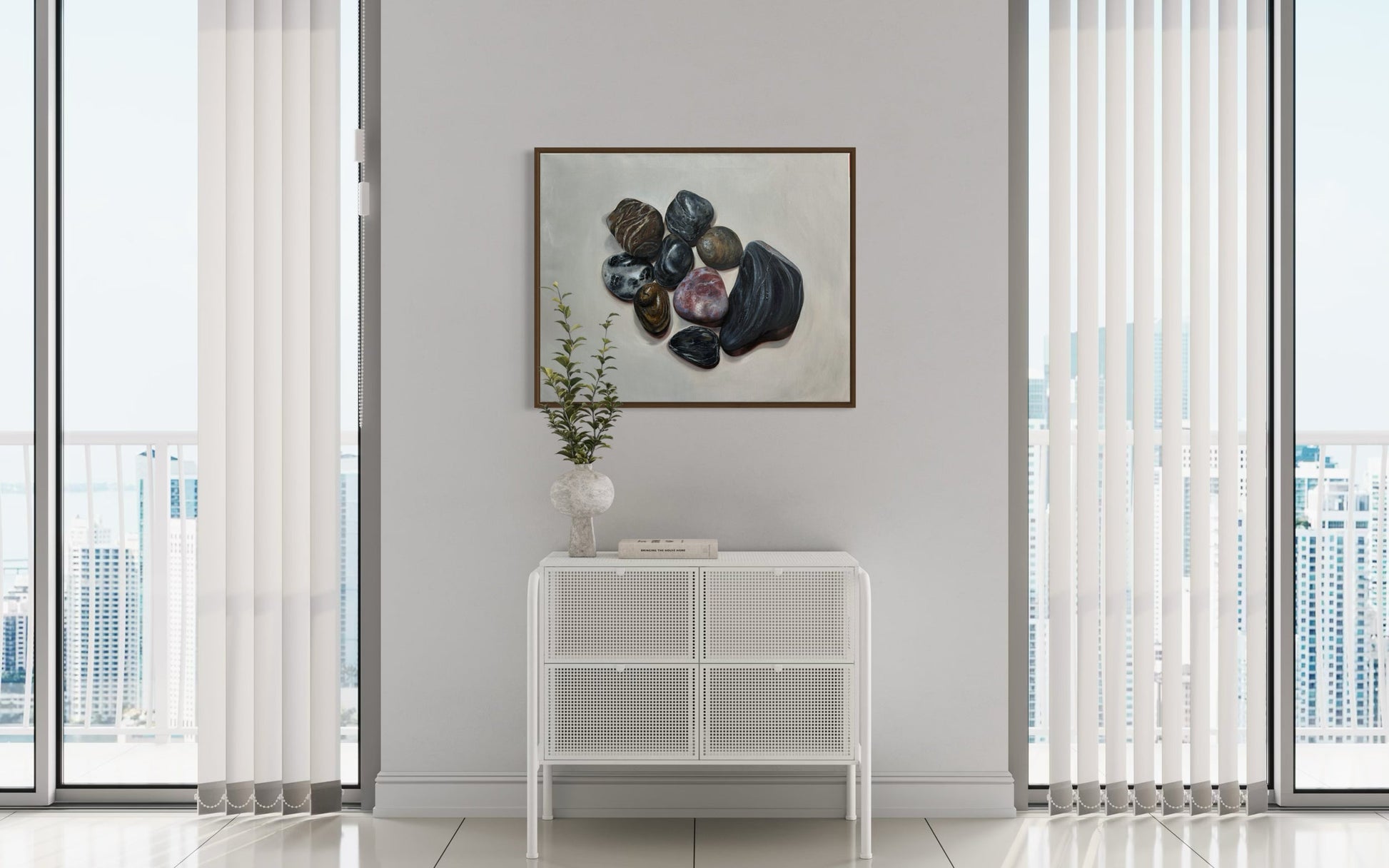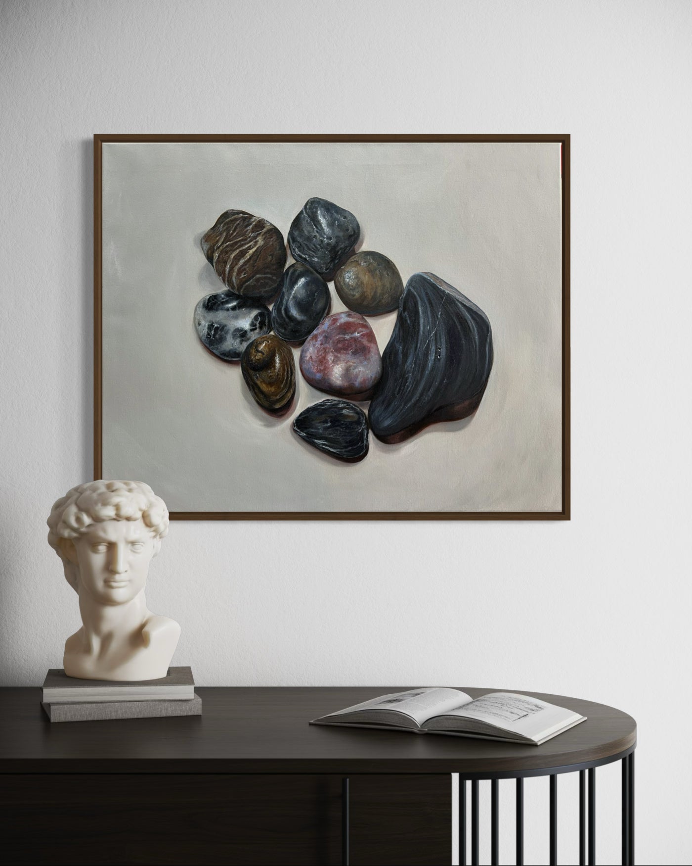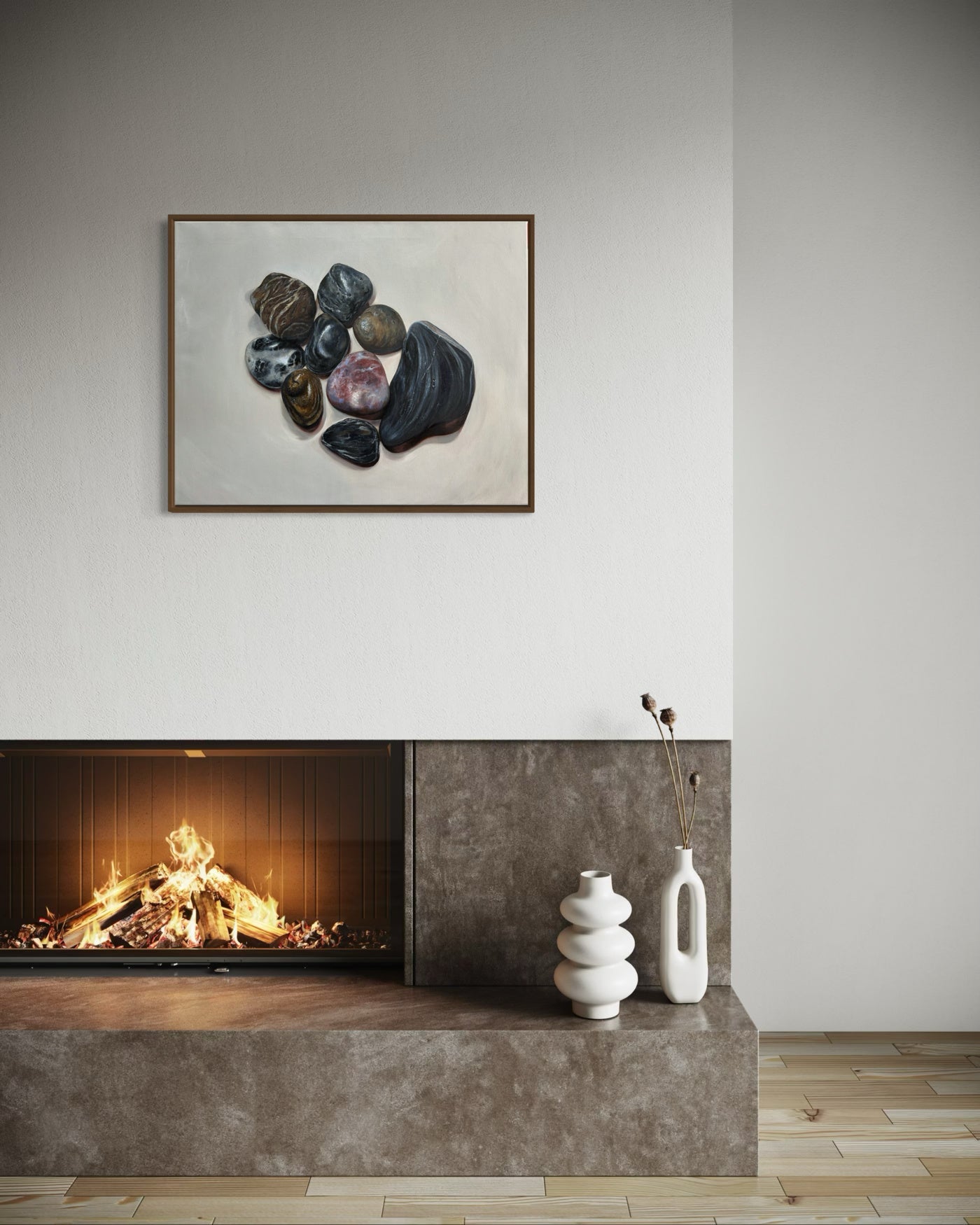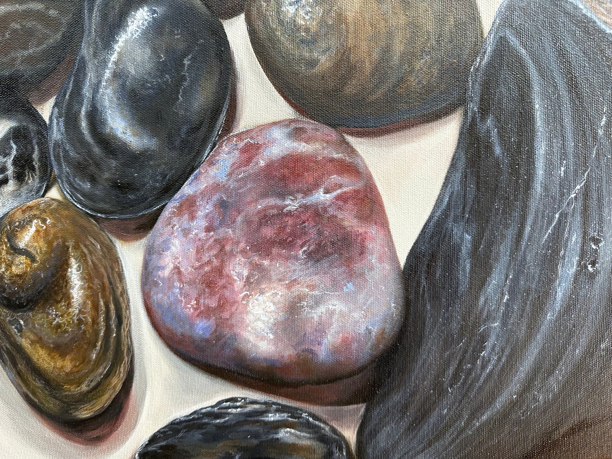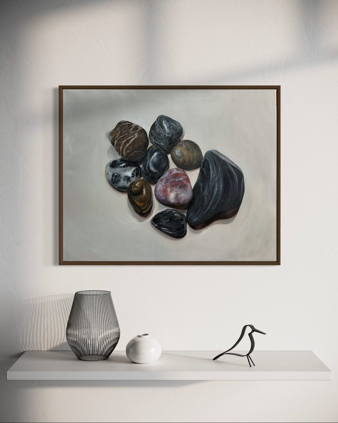 This is a meditative collection of ocean-polished stones rendered with exquisite realism. Each rock tells a silent story through its texture, tone, and timeworn beauty, gathered together like fragments of memory suspended in stillness.