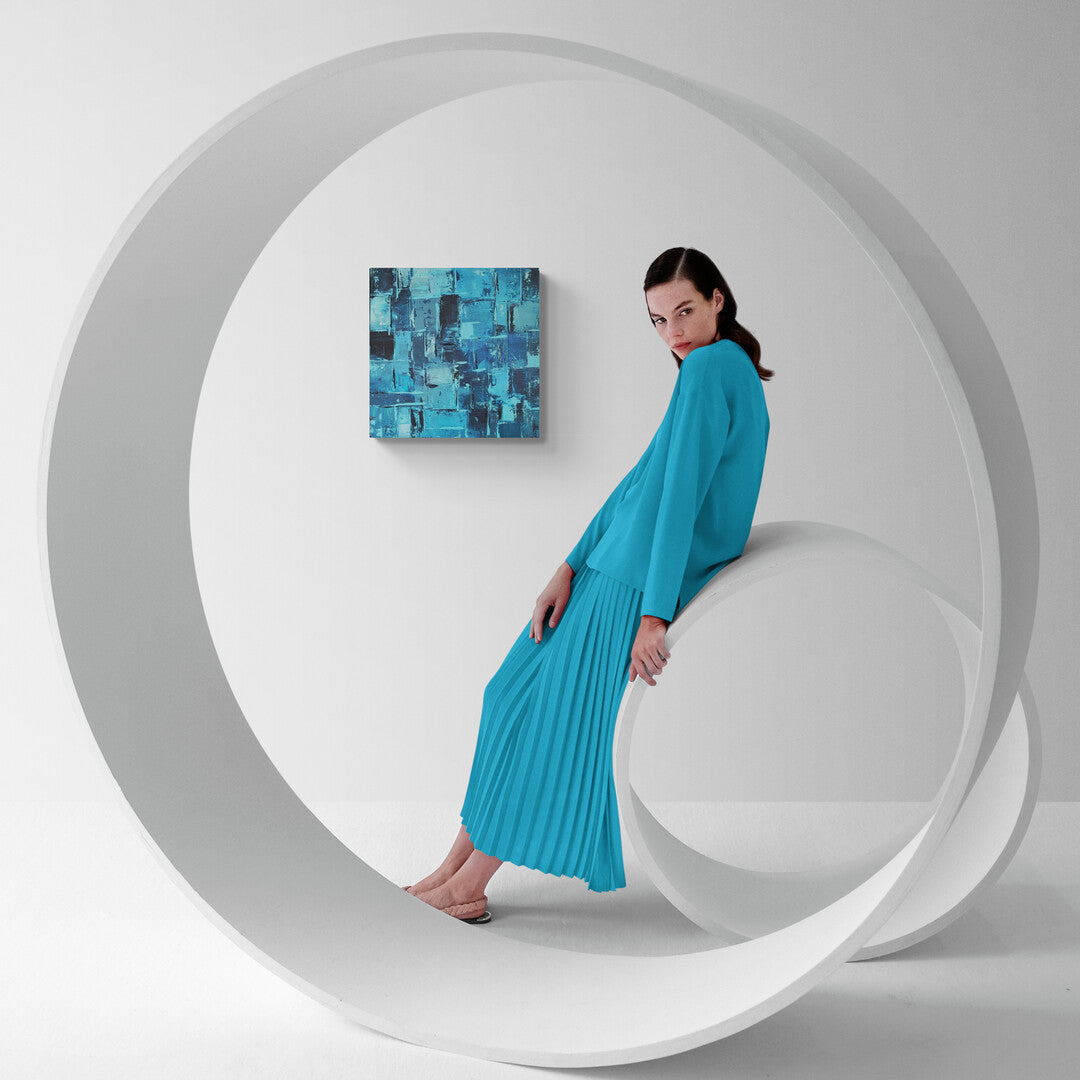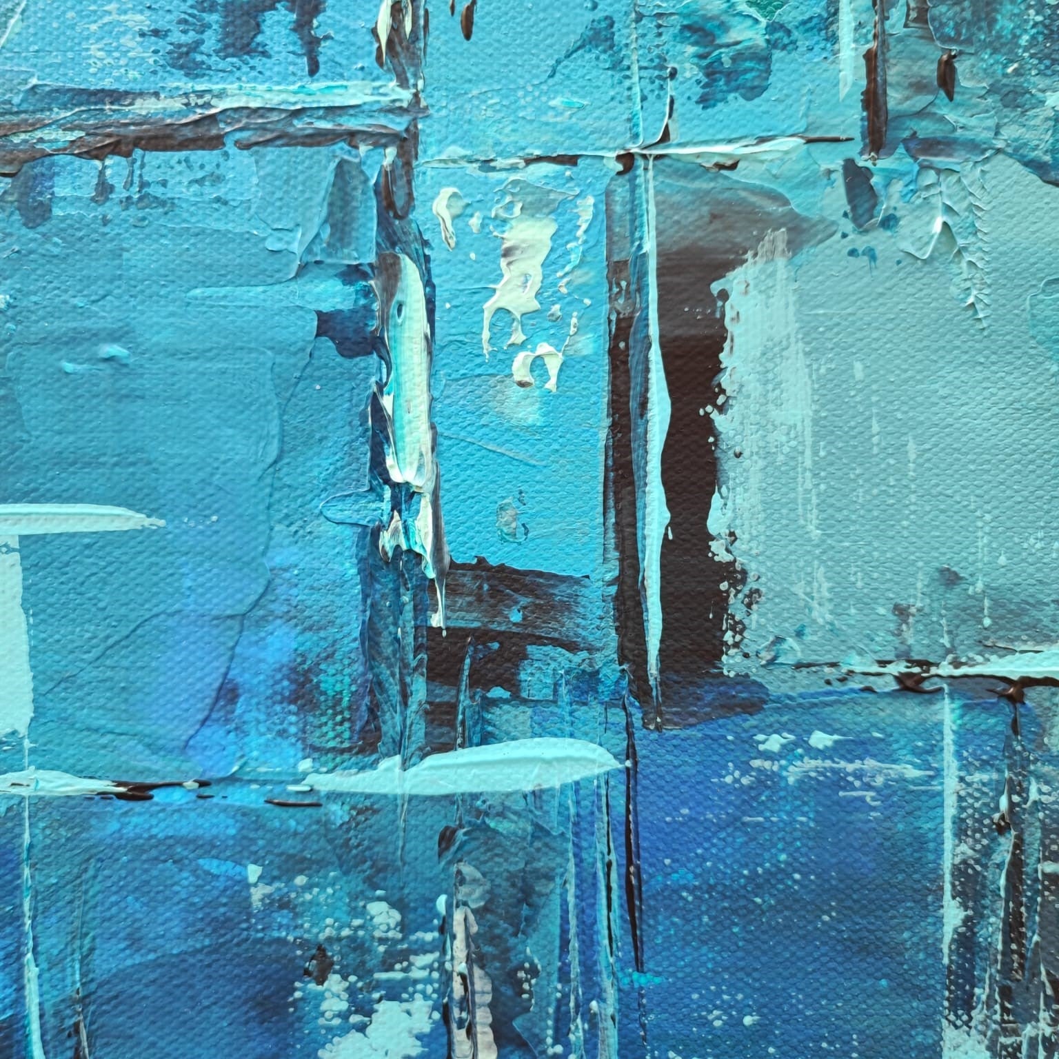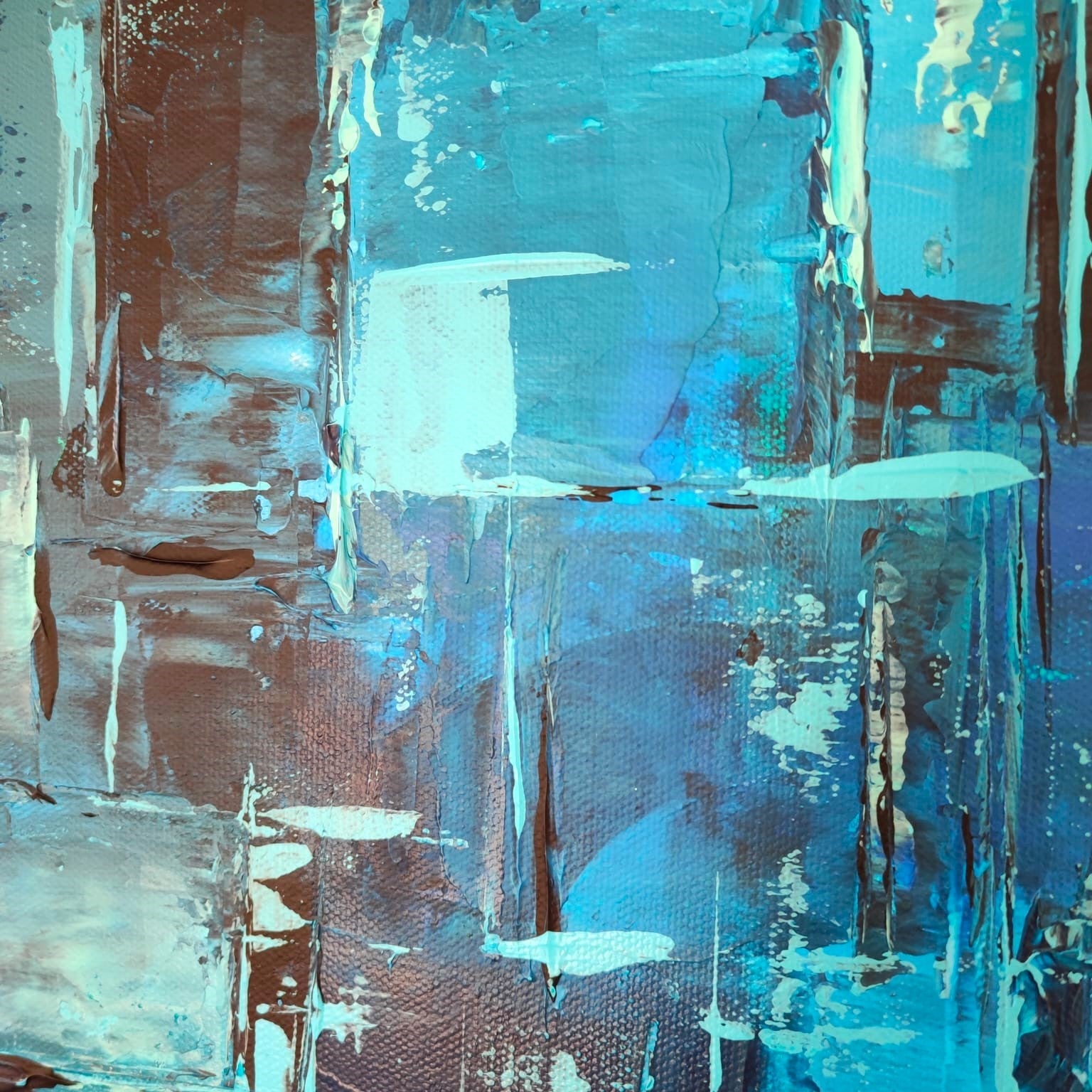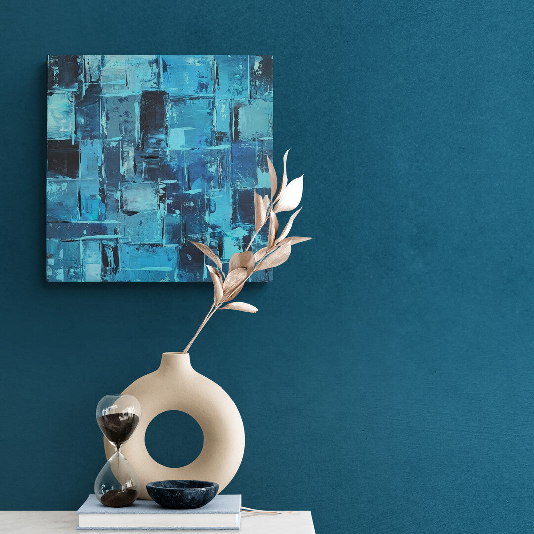 This abstract artwork evokes a sense of calm and depth with its rich indigo and blue palette. The layered textures and geometric forms suggest the fluidity of water and the vastness of the night sky.