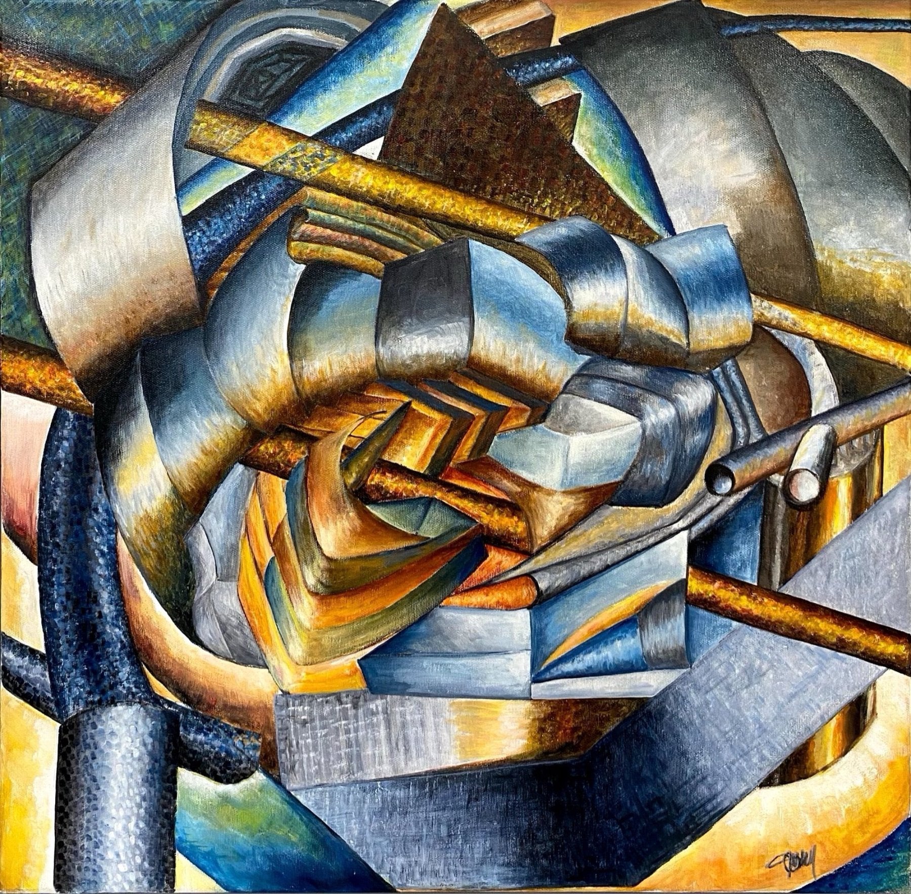 A dynamic abstract painting that captures the essence of modern industry through interlocking shapes and metallic hues. The composition features complex geometric forms that intertwine, suggesting machinery, movement, and the power of technology. The artist employs a palette of steely blues, rusted oranges, and polished silvers to create a sense of depth and texture, evoking both the strength and beauty found within industrial structures. This piece invites viewers to explore the intricate layers and contrasts of the industrial world.