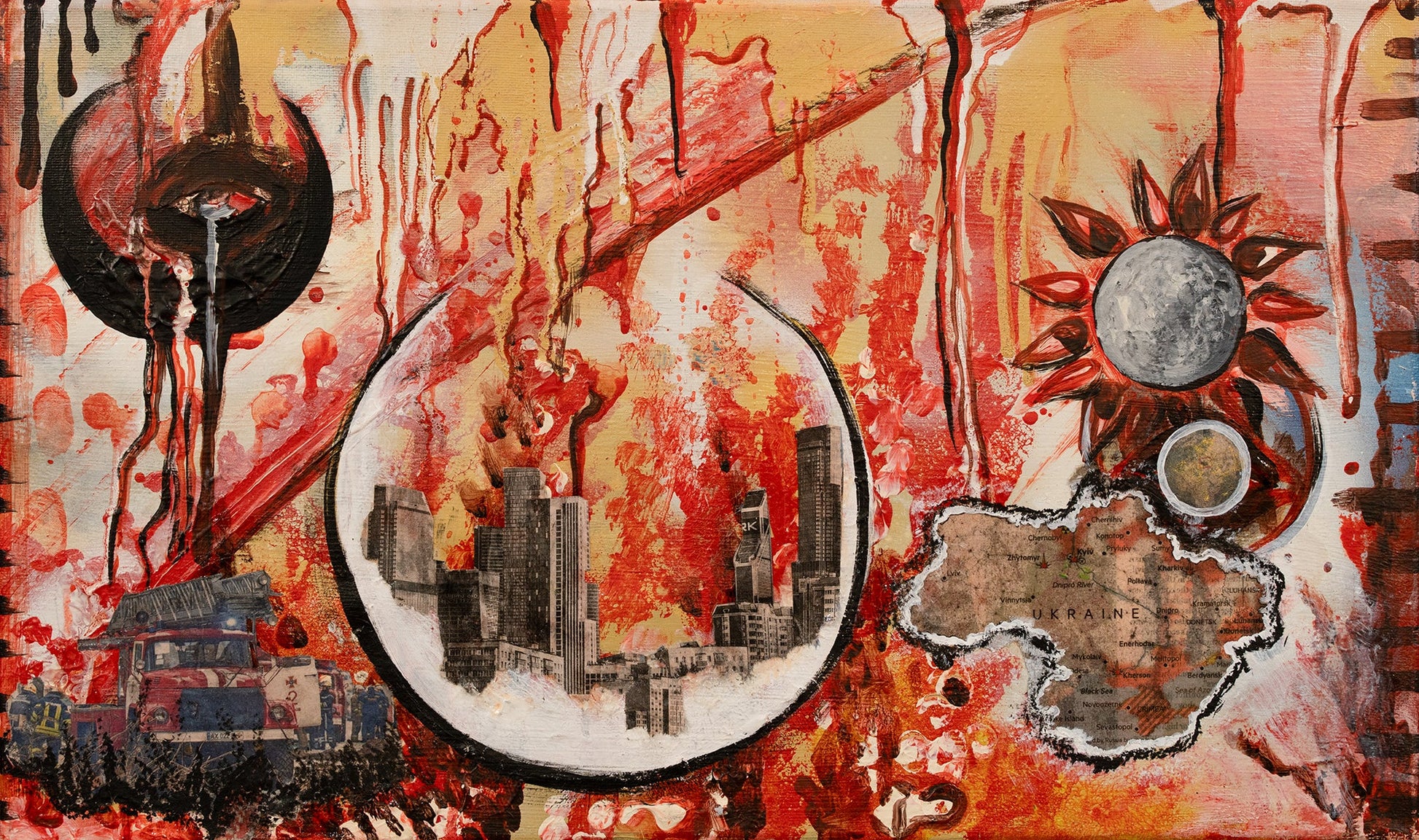 This powerful painting depicts a chaotic and fiery scene, representing the turmoil and destruction brought by war. Dominated by shades of red and orange, the artwork features a cityscape engulfed in flames, symbolizing the devastation of urban warfare. Elements like a burning sun, an eye crying tears of blood, and a map of Ukraine highlight the specific context of conflict and its impact on humanity. The presence of emergency responders suggests the ongoing struggle to cope with the consequences. The artist uses bold, expressive strokes to convey the intense emotions and urgency of the scene.
