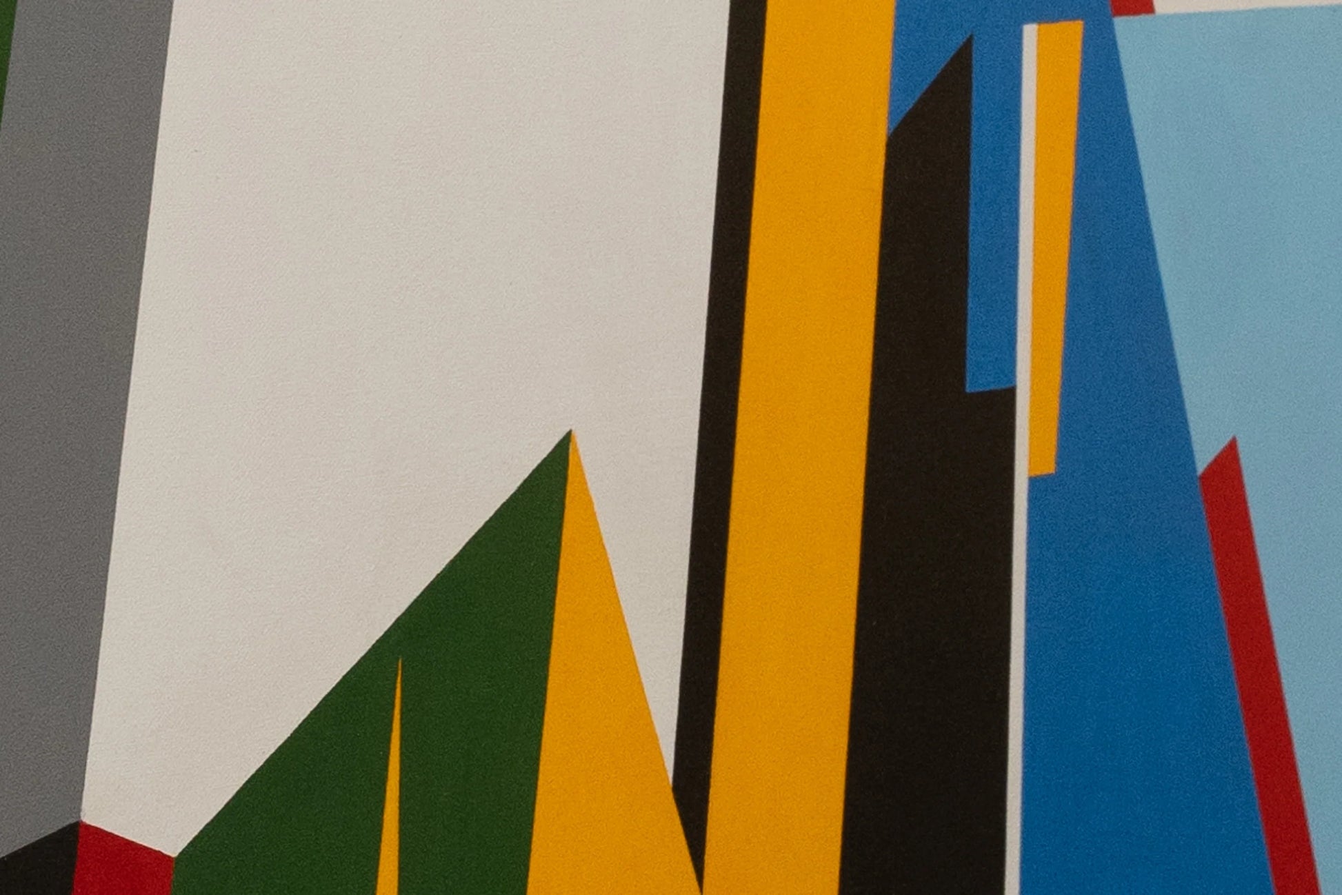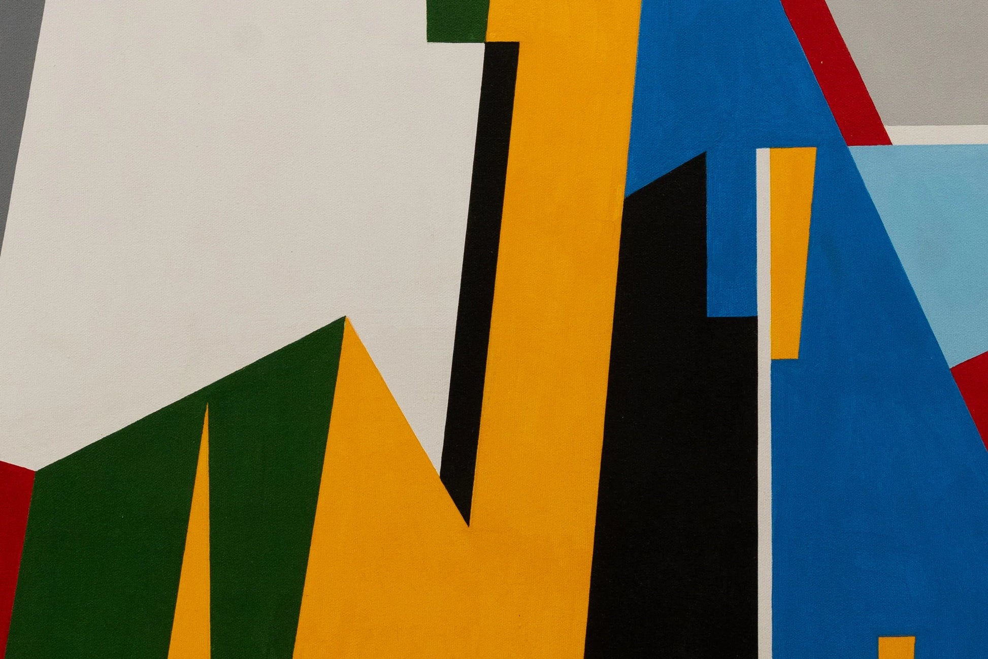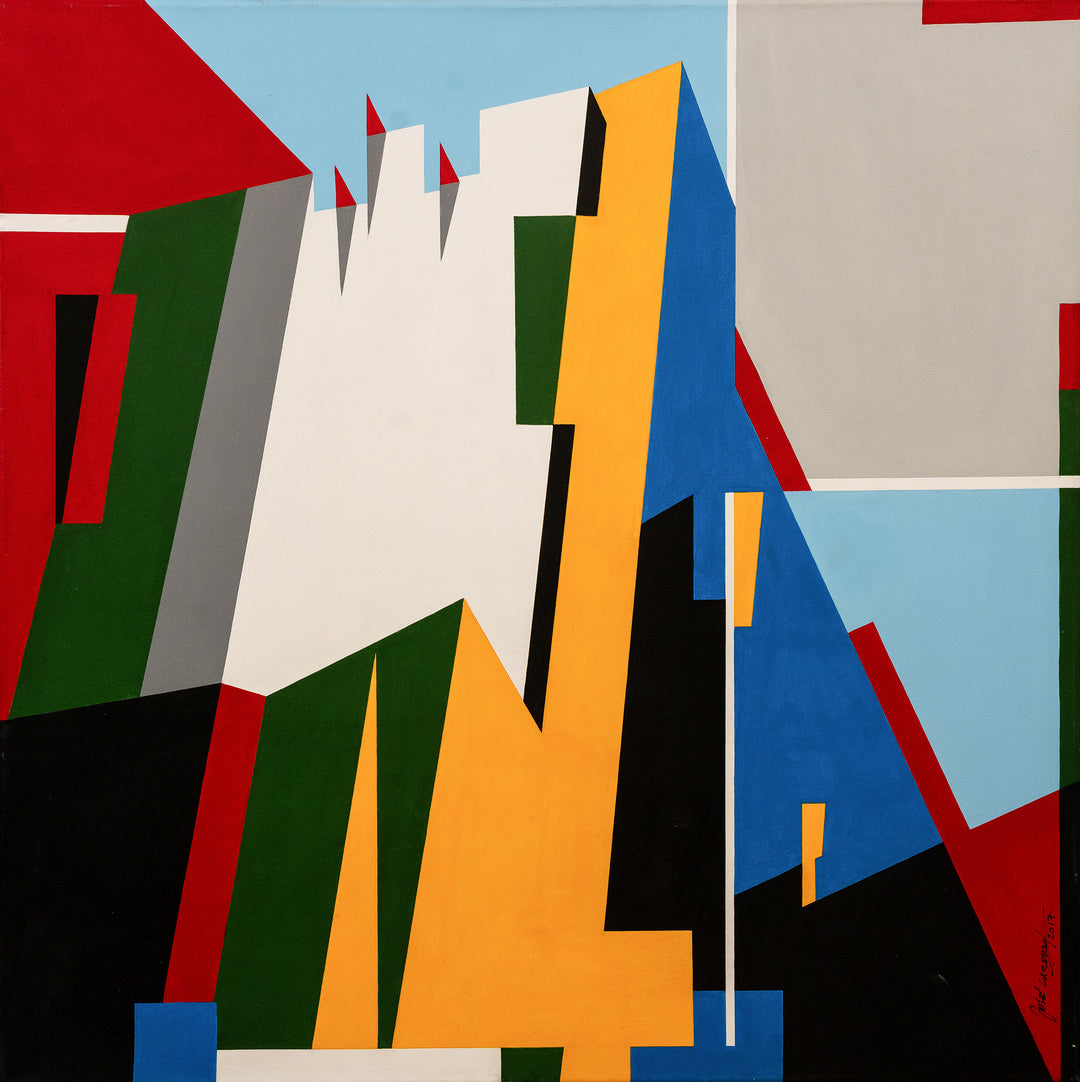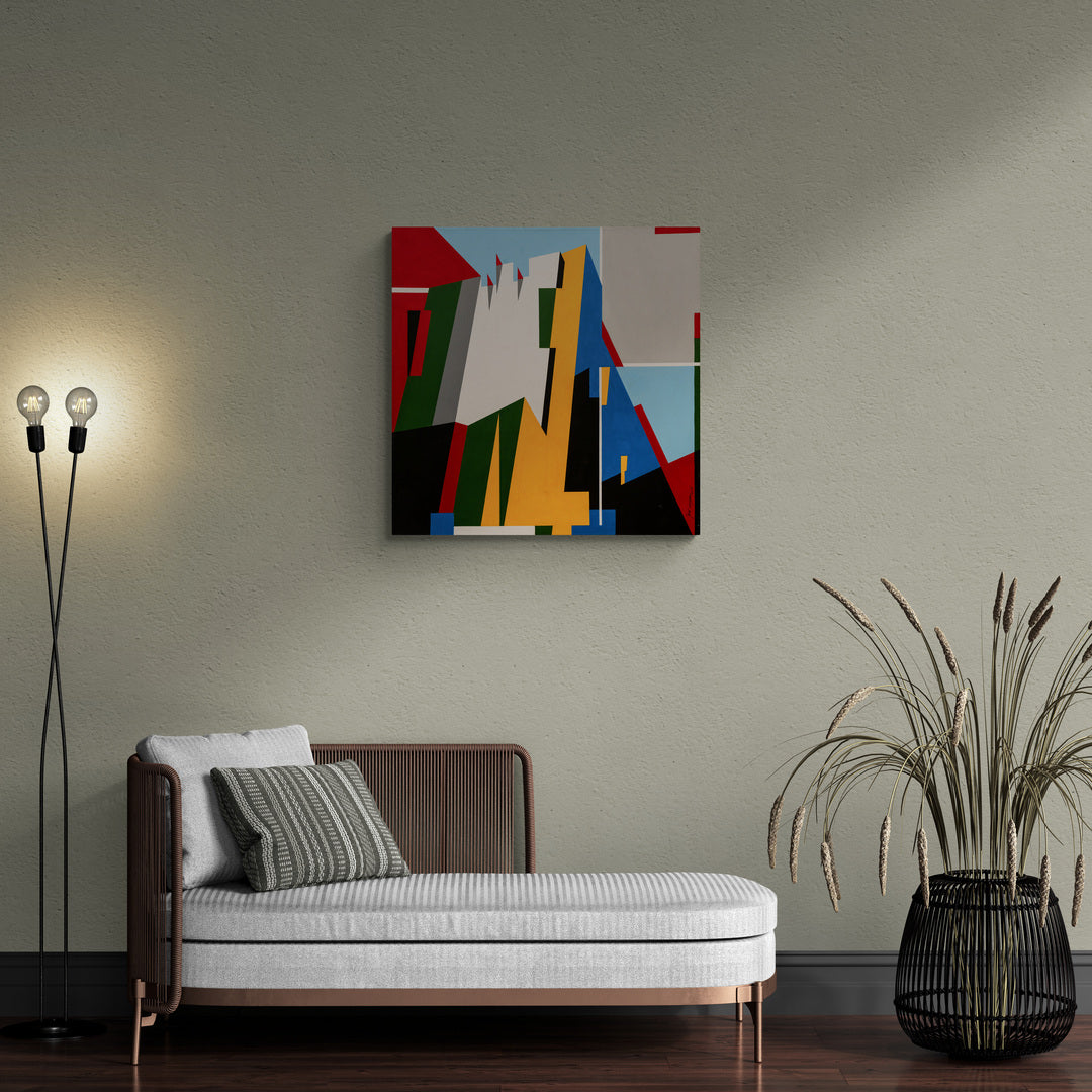 The painting is an abstract composition with a dynamic arrangement of geometric shapes in bold, solid colors. The colors—red, green, blue, yellow, black, white, and grey—are sharply delineated by black lines that create a sense of fragmentation and structure. The background is split into sections of sky blue and light grey, adding to the overall geometric feel. The painting's lack of representational form invites the viewer to interpret the spatial relationships and balance between the shapes and colors. It is signed by the artist in the lower right corner.