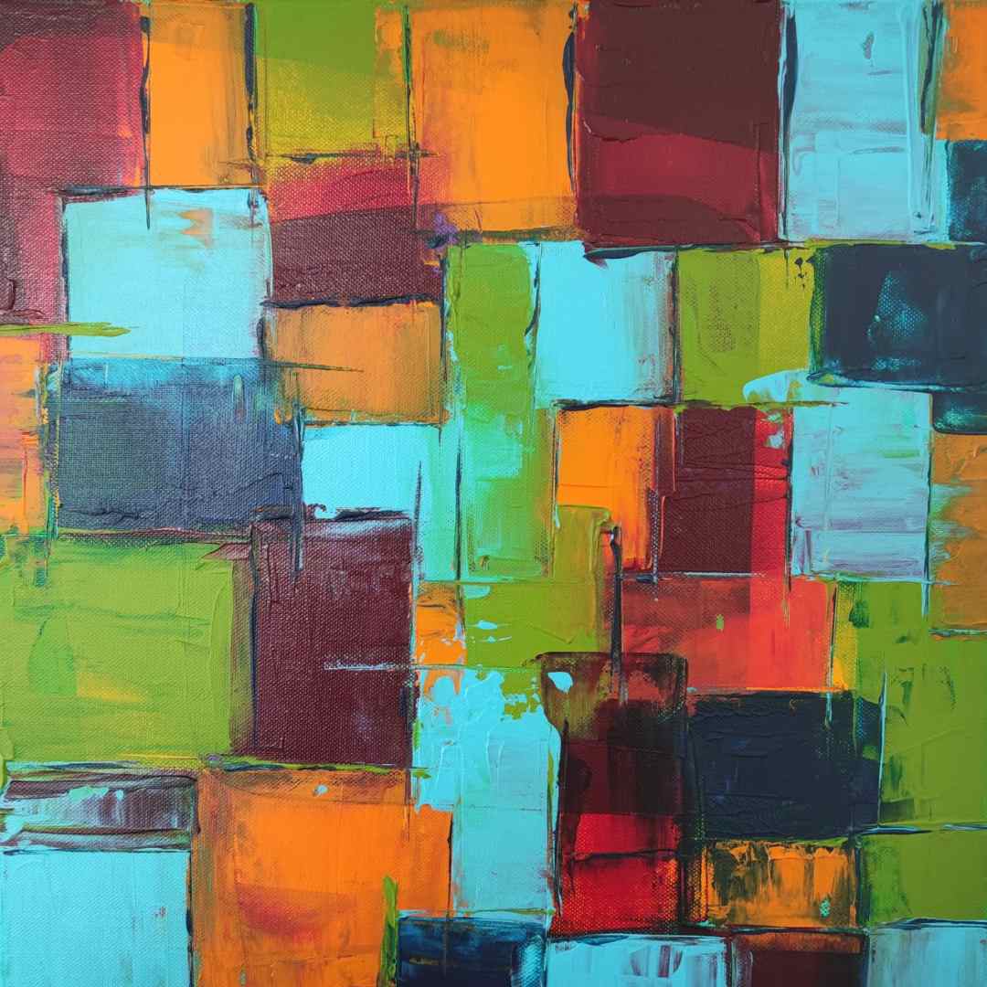 This abstract artwork radiates vibrancy with its harmonious blend of turquoise, green, orange, and red tones. The layered geometric forms evoke a sense of a lively urban landscape, creating a balance between structure and spontaneity.