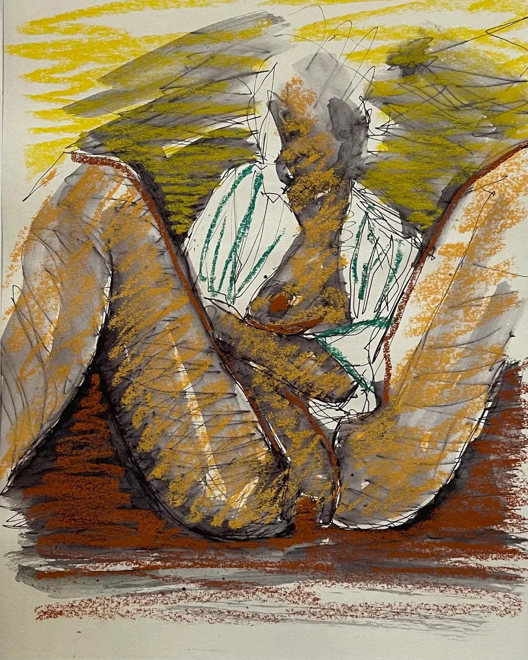 This painting, rich in emotional depth and abstract qualities, seems to convey a powerful, introspective moment. The central figure, defined by expressive lines and contrasting colors, appears to be in a state of contemplation or emotional turmoil. The use of earthy tones, such as browns and yellows, alongside the more vivid greens and the stark whites, adds to the complexity of the emotional landscape being depicted.