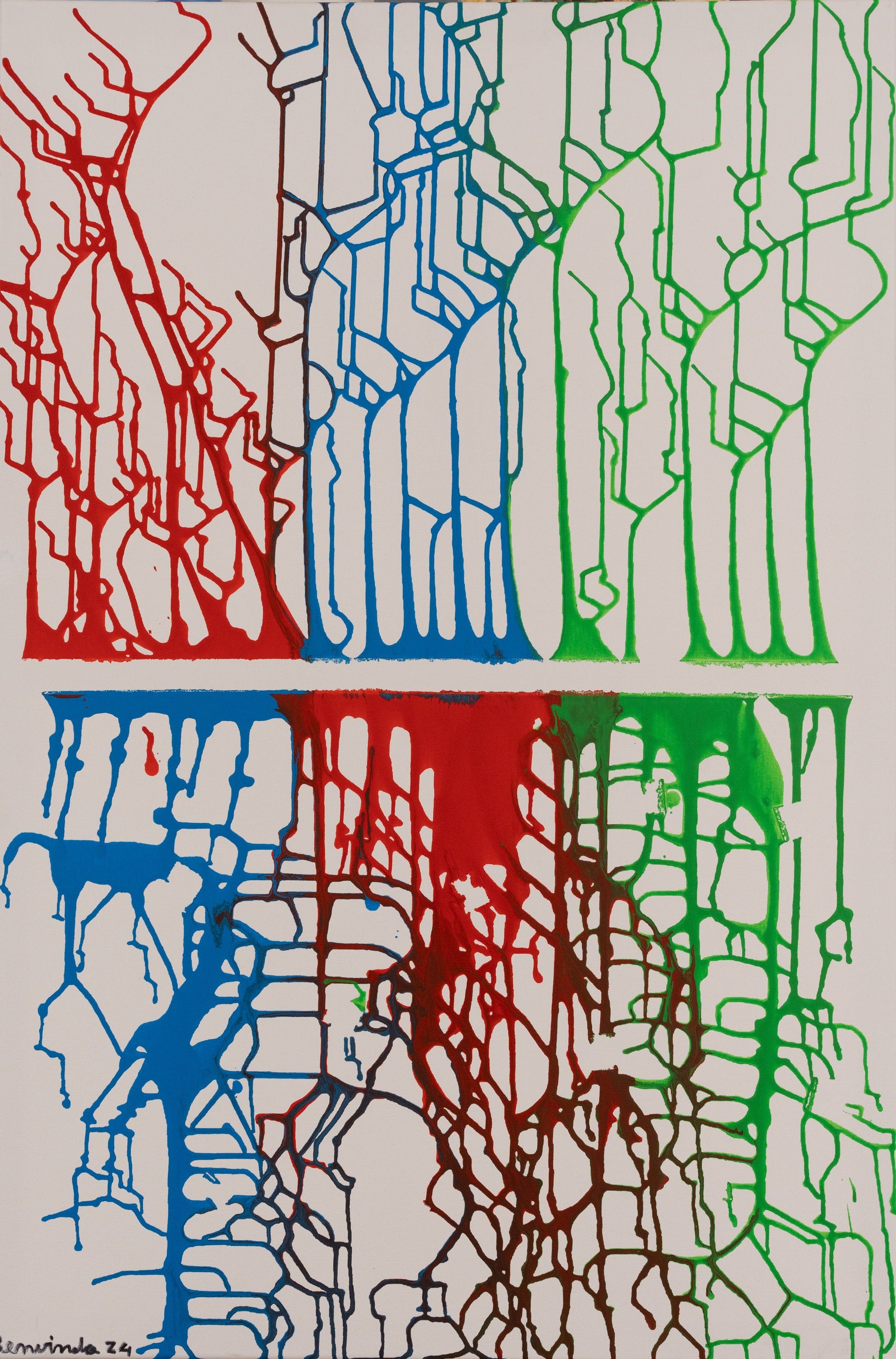 This piece presents an intricate array of crisscrossing lines in primary colors that create a web-like effect. The artwork's geometric precision and the use of red, blue, and green give it a dynamic and visually captivating appearance.
