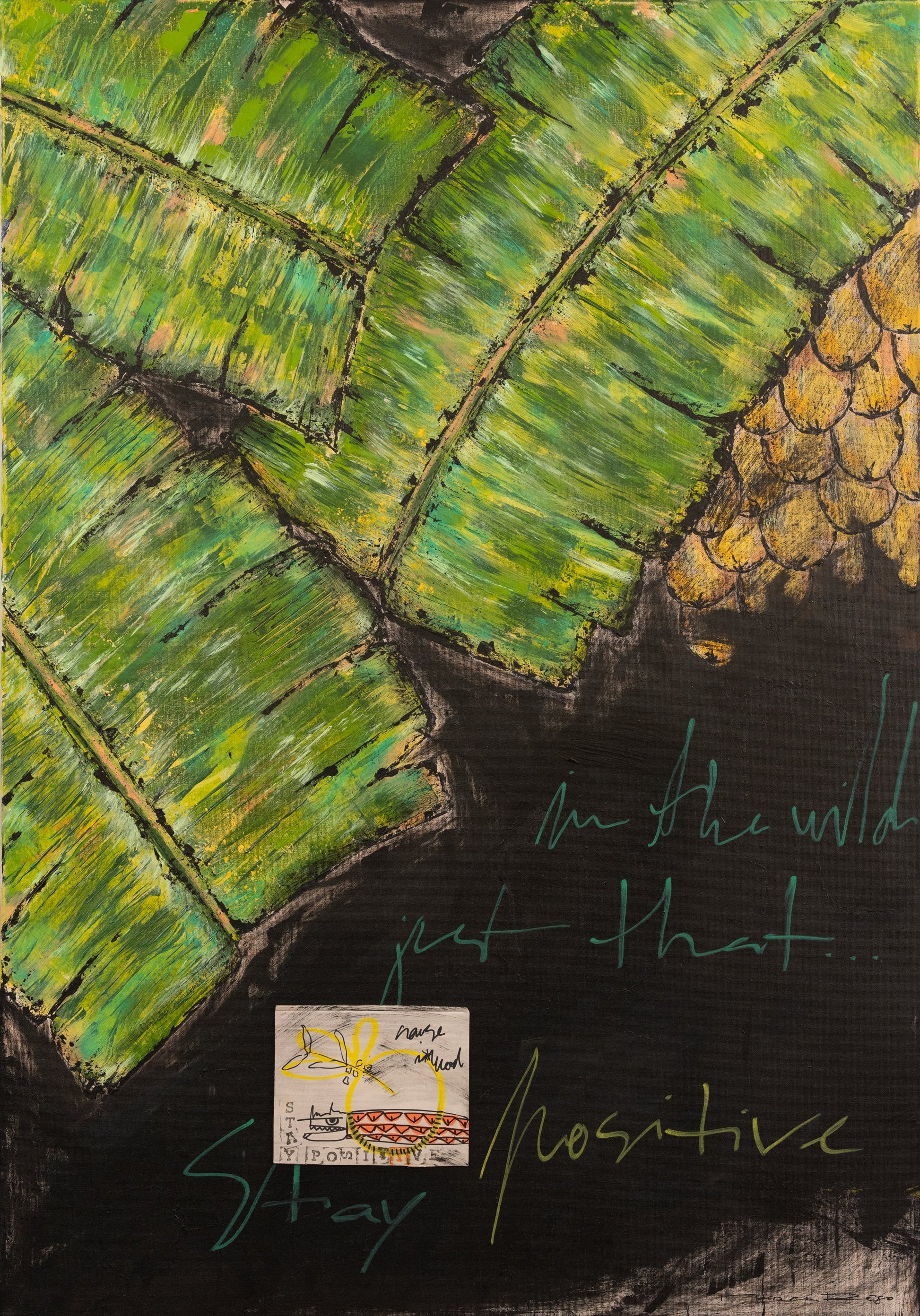 The scales, meticulously textured with thick paint applications, seem to embody a resilient, almost armor-like quality, suggesting both protection and enduring strength. The striking contrast between the vivid green scales and the dark, shadowy backdrop enhances the visual impact, drawing the viewer into a deeper contemplation of resilience and survival. Subtle script and a collage element in the form of a whimsical postcard add layers of narrative and mystery, inviting interpretations of personal journeys and hidden stories.
