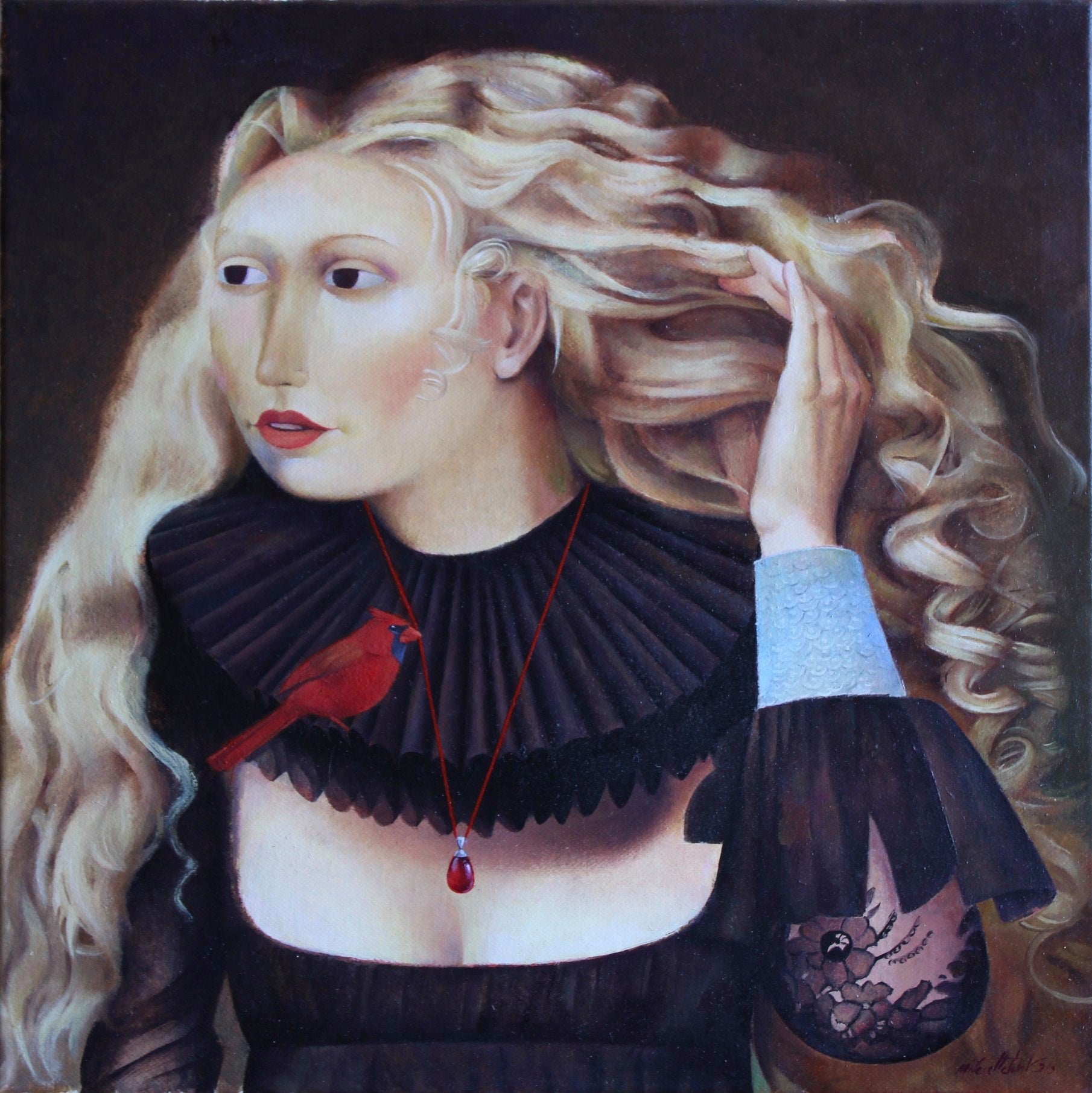 The woman’s flowing blonde hair and dramatic ruffled collar create a sense of mystery, heightened by the vivid red cardinal perched near her neckline, symbolizing both beauty and quiet introspection.