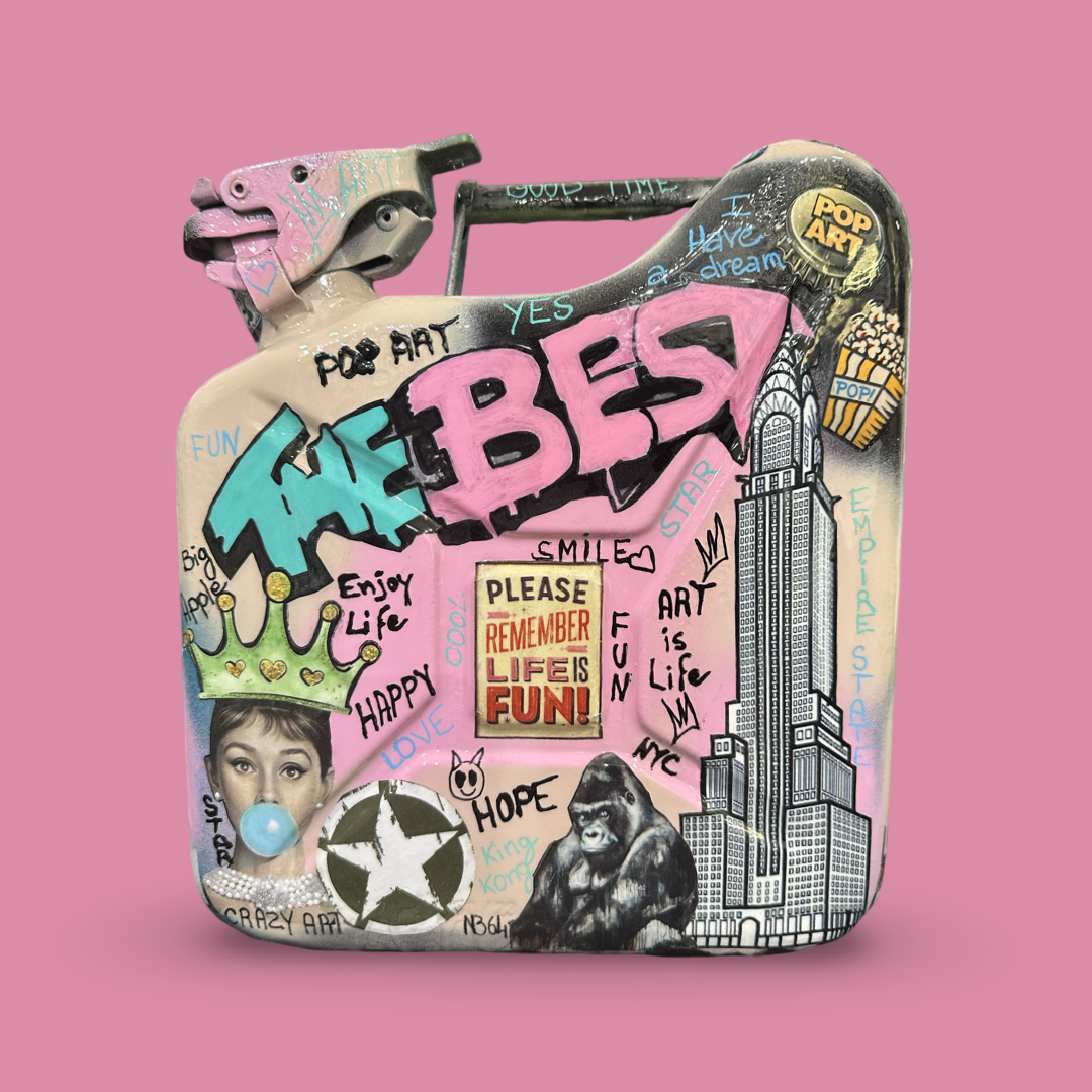 A vibrant fusion of pop culture and urban energy, this mixed-media piece transforms an industrial jerrycan into a playful, thought-provoking artwork.