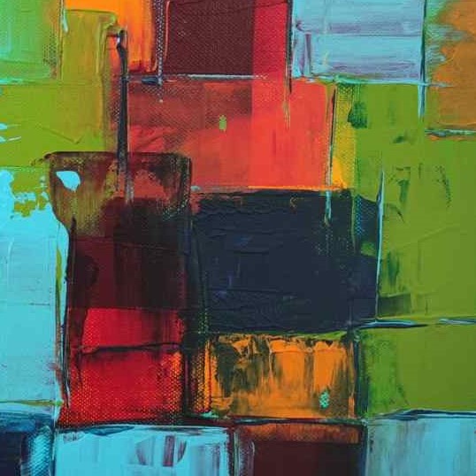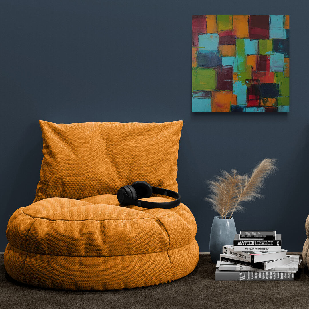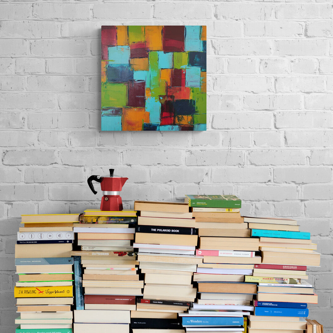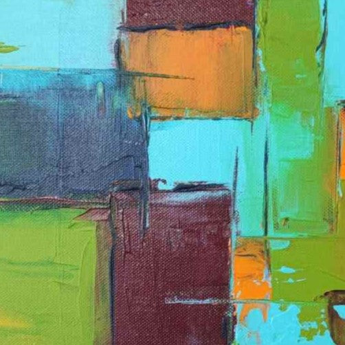 This abstract artwork radiates vibrancy with its harmonious blend of turquoise, green, orange, and red tones. The layered geometric forms evoke a sense of a lively urban landscape, creating a balance between structure and spontaneity.