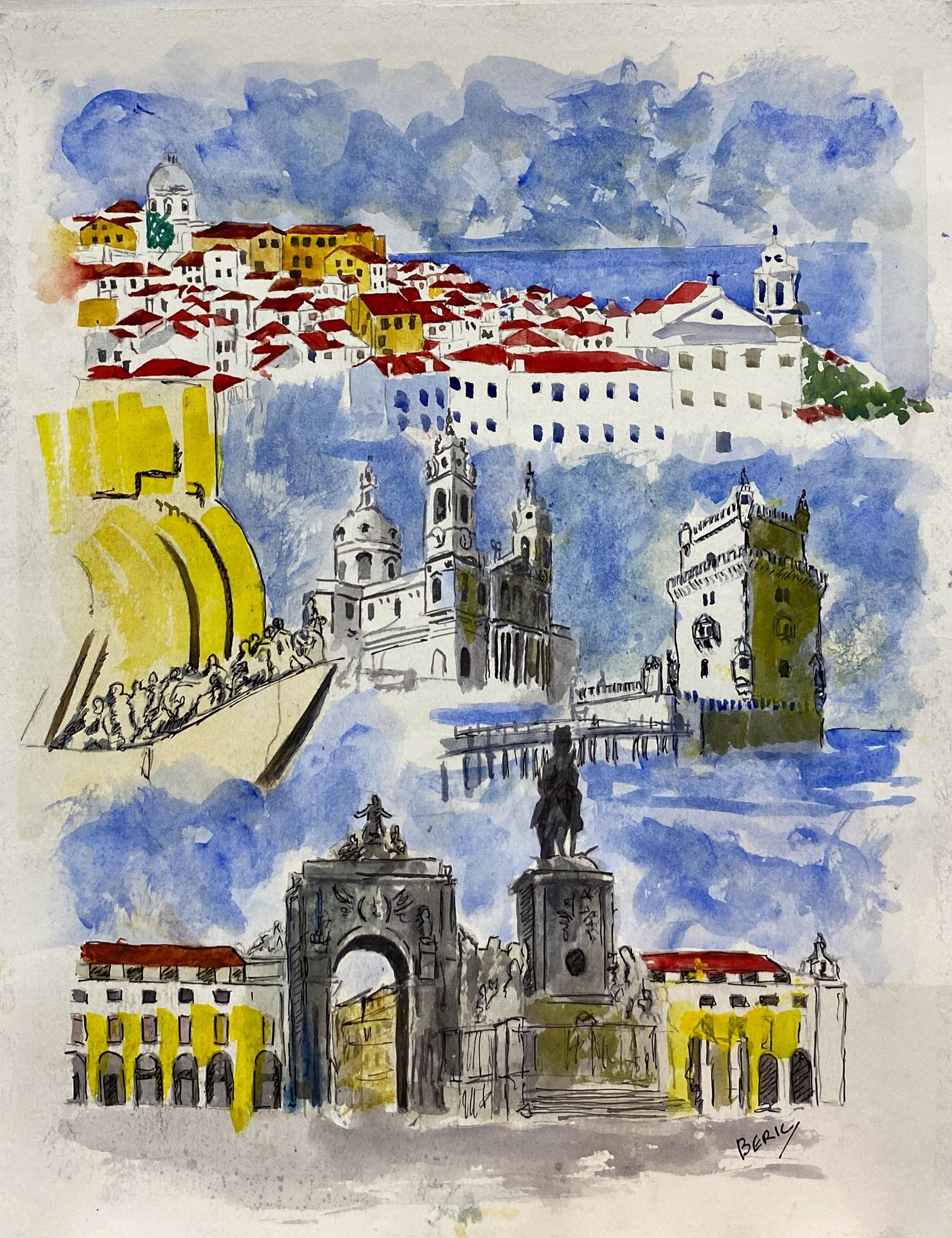 A vibrant watercolor collage that showcases some of the most iconic sites in Lisbon. From the picturesque rooftops of Alfama to the grandeur of the Praça do Comércio, and notable landmarks like the Belém Tower and the Jerónimos Monastery, this piece celebrates the architectural and cultural heritage of Portugal's capital. Each landmark is painted with a blend of detail and impressionistic flair, creating a sense of place that feels both timeless and inviting. The artist’s use of bold colors against soft blues captures the unique spirit and beauty of Lisbon.