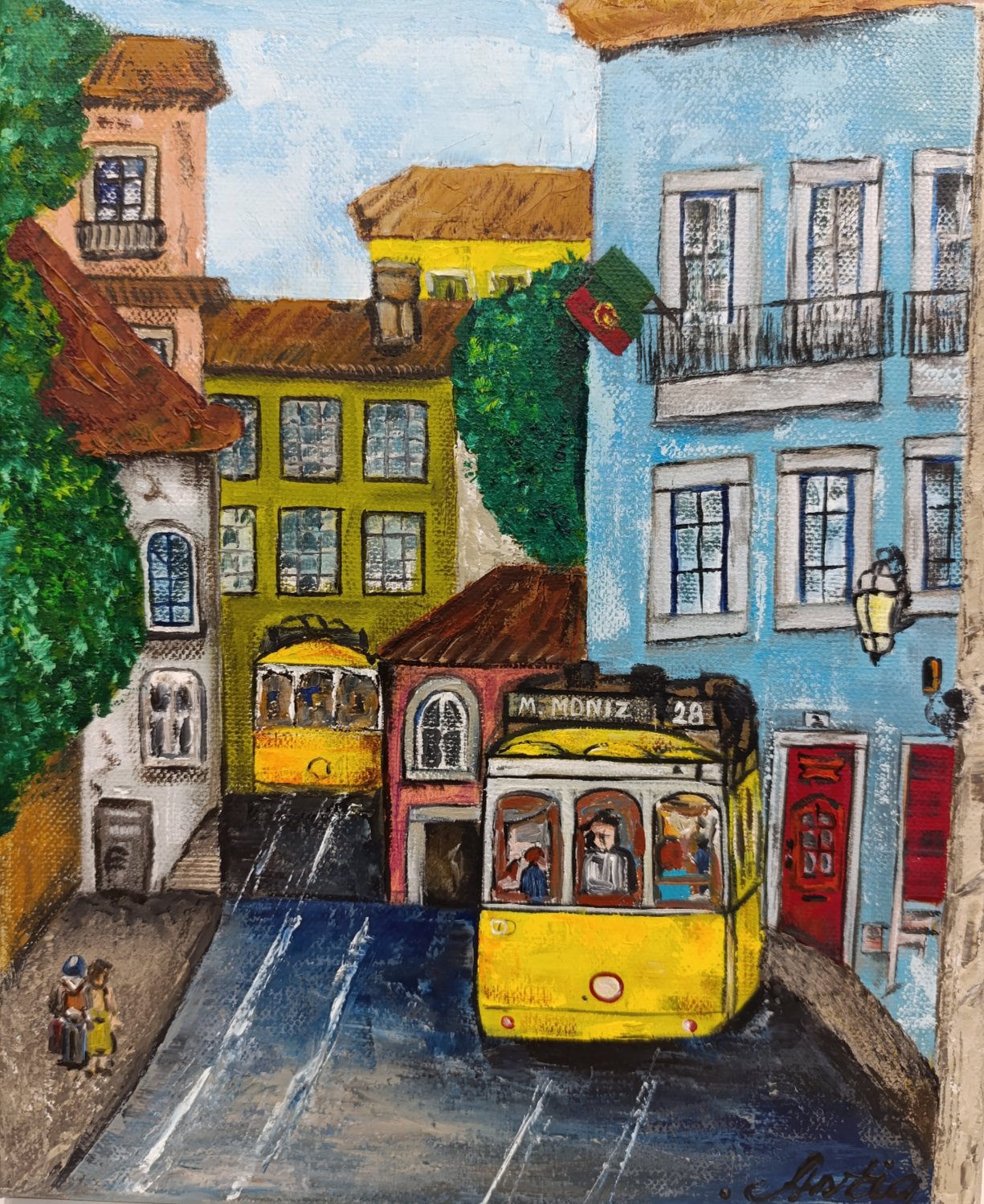 In this vivid oil painting, the artist Anastasia Antia once again captures the timeless essence of Lisbon, focusing on its famous trams. The central element is tram number 28, which winds through the streets of the historic city, framed by colorful facades of traditional houses, vines climbing the walls, and the Portuguese flag flying in the background. The scene conveys a warm, welcoming atmosphere with its vibrant hues, expressive details, and a strong sense of place. The contrast of the brightly colored tram against the pale blue and pastel-colored houses creates a striking visual balance, bringing to life Lisbon's characteristic charm.