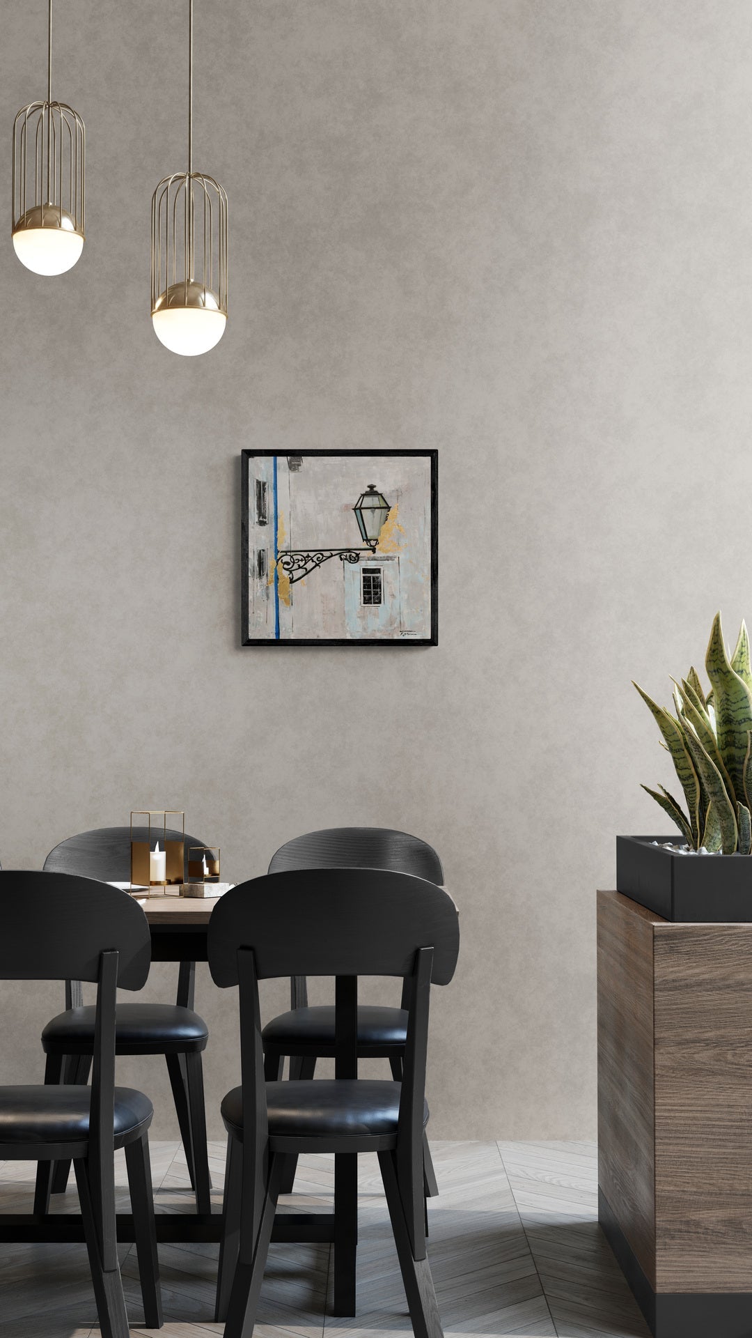 This painting captures the essence of Lisbon's charming streets, featuring a detailed antique lantern extending from a wrought iron bracket against a textured wall with touches of gold leaf, beside a solitary window.